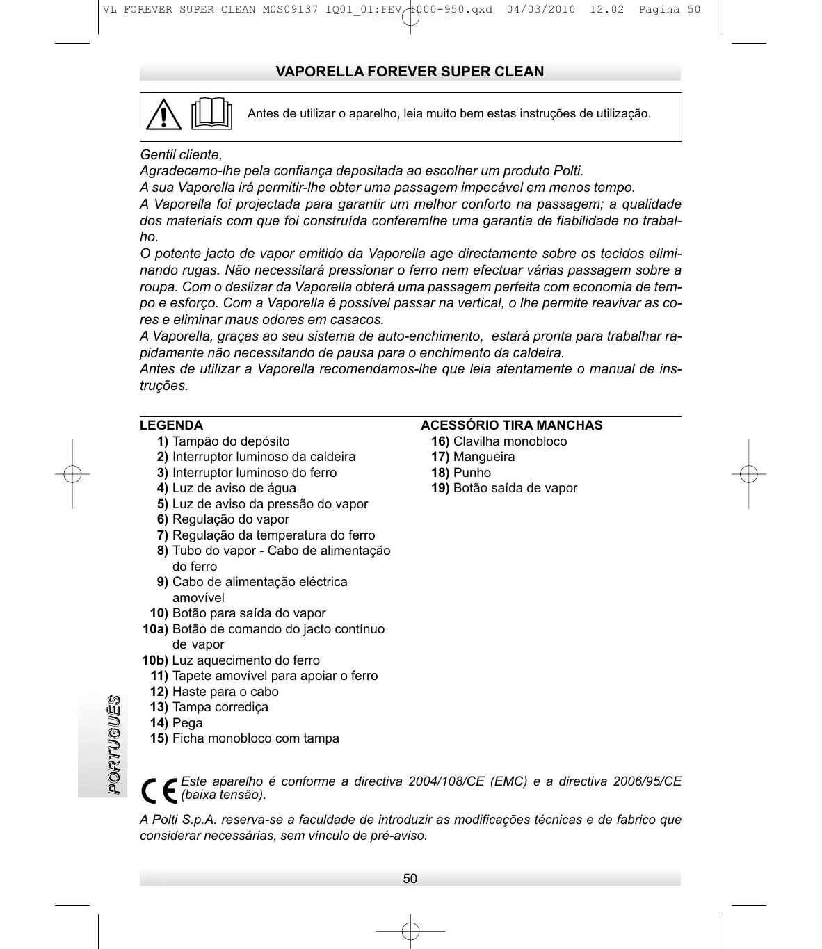 Baixe as instruções para o seu Ferro a vapor em formato PDF gratuitamente! Encontre o seu manual VAPORELLA FOREVER SUPER CLEAN - POLTI e retome o controlo do seu dispositivo eletrónico. Nesta página estão publicados todos os documentos necessários para a utilização do seu dispositivo. VAPORELLA FOREVER SUPER CLEAN da marca POLTI.