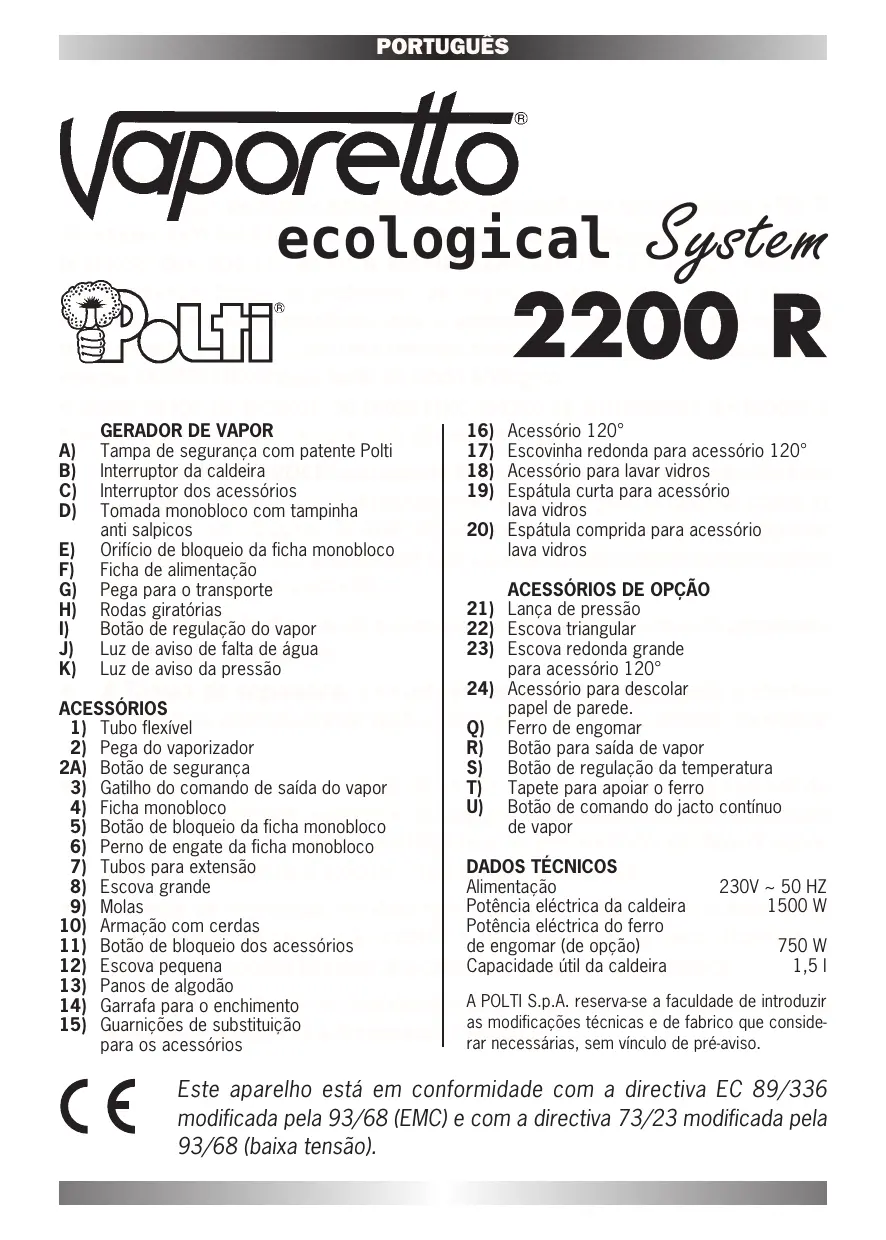 Tubos para extensão de 0 a 60 gr./ min. durante pode ser regulado a utilização. 230V ~ 50 HZ Potência eléctrica da caldeirae o termóstato 1500 W Molas válvula de segurança, os dois termóstatos de segurança Potência eléctrica do ferro Armação com cerdas suplementar contra odefuncionamento engomar (de opção)a seco, mantêm 750 W Botão de bloqueiode dos protecção acessórios Capacidade útil da caldeira 1,5 l Escova pequena constantemente, em condições VAPORETTO, de absoluta segurança. Panos de algodão POLTI S.p.A. reserva-se a faculdade de introduzir acessórios e todos os componentes Aforam fabricados com materiais de alta Garrafa para o enchimento as modificações técnicas e de fabrico que consideGuarnições substituição qualidade e resistentes a temperaturas elevadas. rar necessárias, sem vínculo de pré-aviso. para os acessórios Este aparelho está em conformidade com a directiva EC 89/336 modificada pela 93/68 (EMC) e com a directiva 73/23 modificada pela 93/68 (baixa tensão). PORTUGUÊS P R E C A U Ç Õ E S PA R A O U S O