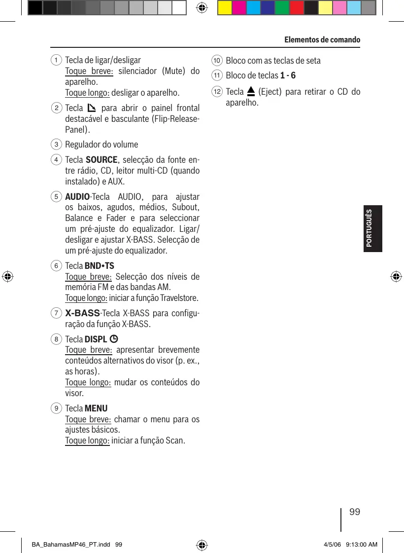 BA_BahamasMP46_ES.indd 98 4/5/06 9:01:57 AM Elementos de comando 1 Tecla de ligar/desligar Toque breve: silenciador (Mute) do aparelho. Toque longo: desligar o aparelho. para abrir o painel frontal 2 Tecla destacável e basculante (Flip-ReleasePanel). : Bloco com as teclas de seta ; Bloco de teclas 1 - 6 (Eject) para retirar o CD do < Tecla aparelho. 3 Regulador do volume 4 Tecla SOURCE, selecção da fonte entre rádio, CD, leitor multi-CD (quando instalado) e AUX. PORTUGUÊS 5 AUDIO-Tecla AUDIO, para ajustar os baixos, agudos, médios, Subout, Balance e Fader e para seleccionar um pré-ajuste do equalizador. Ligar/ desligar e ajustar X-BASS. Selecção de um pré-ajuste do equalizador. 6 Tecla BND•TS Toque breve: Selecção dos níveis de memória FM e das bandas AM. Toque longo: iniciar a função Travelstore. 7 X-BASS-Tecla X-BASS para configuração da função X-BASS. 8 Tecla DISPL Toque breve: apresentar brevemente conteúdos alternativos do visor (p. ex., as horas). Toque longo: mudar os conteúdos do visor. 9 Tecla MENU Toque breve: chamar o menu para os ajustes básicos. Toque longo: iniciar a função Scan.