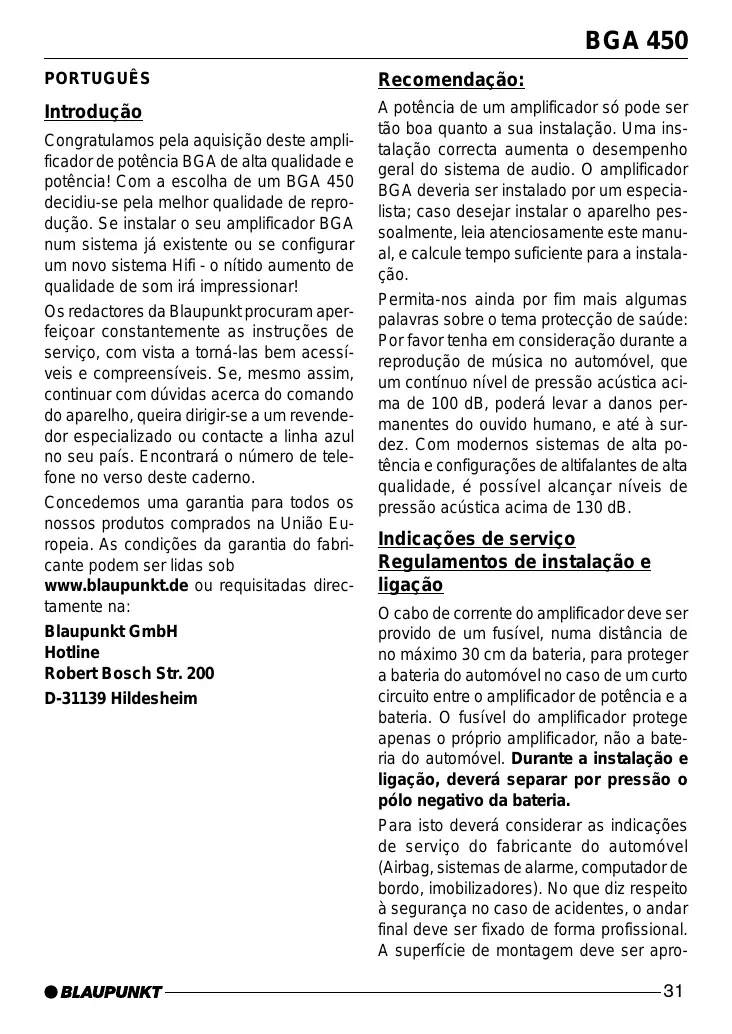 Congratulamos pela aquisição deste amplificador de potência BGA de alta qualidade e potência! Com a escolha de um BGA 450 decidiu-se pela melhor qualidade de reprodução. Se instalar o seu amplificador BGA num sistema já existente ou se configurar um novo sistema Hifi - o nítido aumento de qualidade de som irá impressionar! Os redactores da Blaupunkt procuram aperfeiçoar constantemente as instruções de serviço, com vista a torná-las bem acessíveis e compreensíveis. Se, mesmo assim, continuar com dúvidas acerca do comando do aparelho, queira dirigir-se a um revendedor especializado ou contacte a linha azul no seu país. Encontrará o número de telefone no verso deste caderno. Concedemos uma garantia para todos os nossos produtos comprados na União Europeia. As condições da garantia do fabricante podem ser lidas sob www.blaupunkt.de ou requisitadas directamente na: Blaupunkt GmbH Hotline Robert Bosch Str. 200 D-31139 Hildesheim
