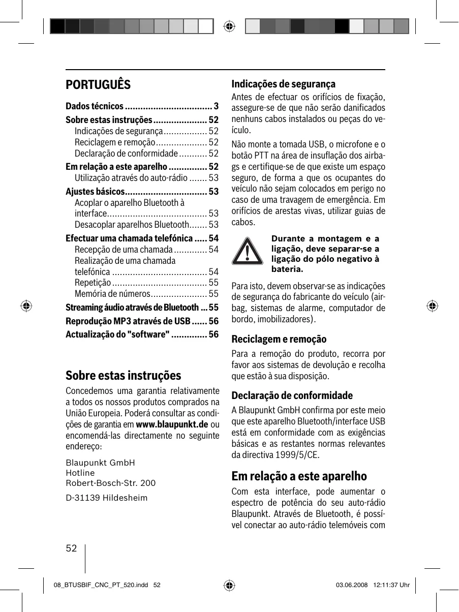 - Actualização do "software" Sobre estas instruções Concedemos uma garantia relativamente a todos os nossos produtos comprados na União Europeia. Poderá consultar as condições de garantia em www.blaupunkt.de ou encomendá-las directamente no seguinte endereço: Blaupunkt GmbH Hotline Robert-Bosch-Str. 200 D-31139 Hildesheim Indicações de segurança Antes de efectuar os orifícios de fixação, assegure-se de que não serão danificados nenhuns cabos instalados ou peças do veículo. Não monte a tomada USB, o microfone e o botão PTT na área de insuflação dos airbags e certifique-se de que existe um espaço seguro, de forma a que os ocupantes do veículo não sejam colocados em perigo no caso de uma travagem de emergência. Em orifícios de arestas vivas, utilizar guias de cabos. Durante a montagem e a ligação, deve separar-se a ligação do pólo negativo à bateria. Para isto, devem observar-se as indicações de segurança do fabricante do veículo (airbag, sistemas de alarme, computador de bordo, imobilizadores). Reciclagem e remoção Para a remoção do produto, recorra por favor aos sistemas de devolução e recolha que estão à sua disposição. Declaração de conformidade A Blaupunkt GmbH confirma por este meio que este aparelho Bluetooth/interface USB está em conformidade com as exigências básicas e as restantes normas relevantes da directiva 1999/5/CE. Em relação a este aparelho Com esta interface, pode aumentar o espectro de potência do seu auto-rádio Blaupunkt. Através de Bluetooth, é possível conectar ao auto-rádio telemóveis com p. 56