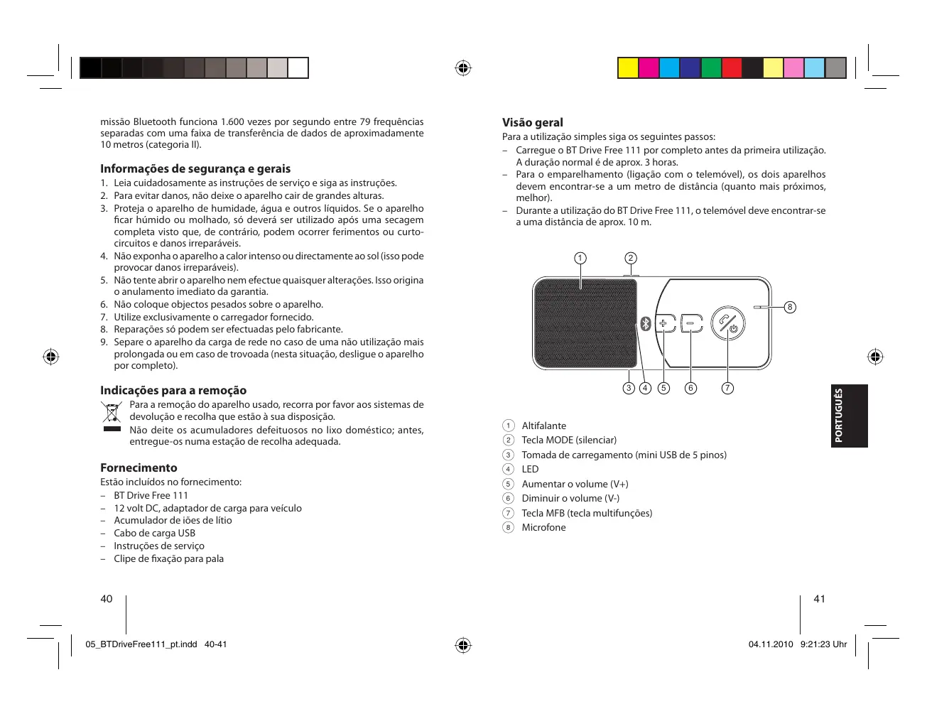 Visão geral Para a utilização simples siga os seguintes passos: – Carregue o BT Drive Free 111 por completo antes da primeira utilização. A duração normal é de aprox. 3 horas. – Para o emparelhamento (ligação com o telemóvel), os dois aparelhos devem encontrar-se a um metro de distância (quanto mais próximos, melhor). – Durante a utilização do BT Drive Free 111, o telemóvel deve encontrar-se a uma distância de aprox. 10 m. 1