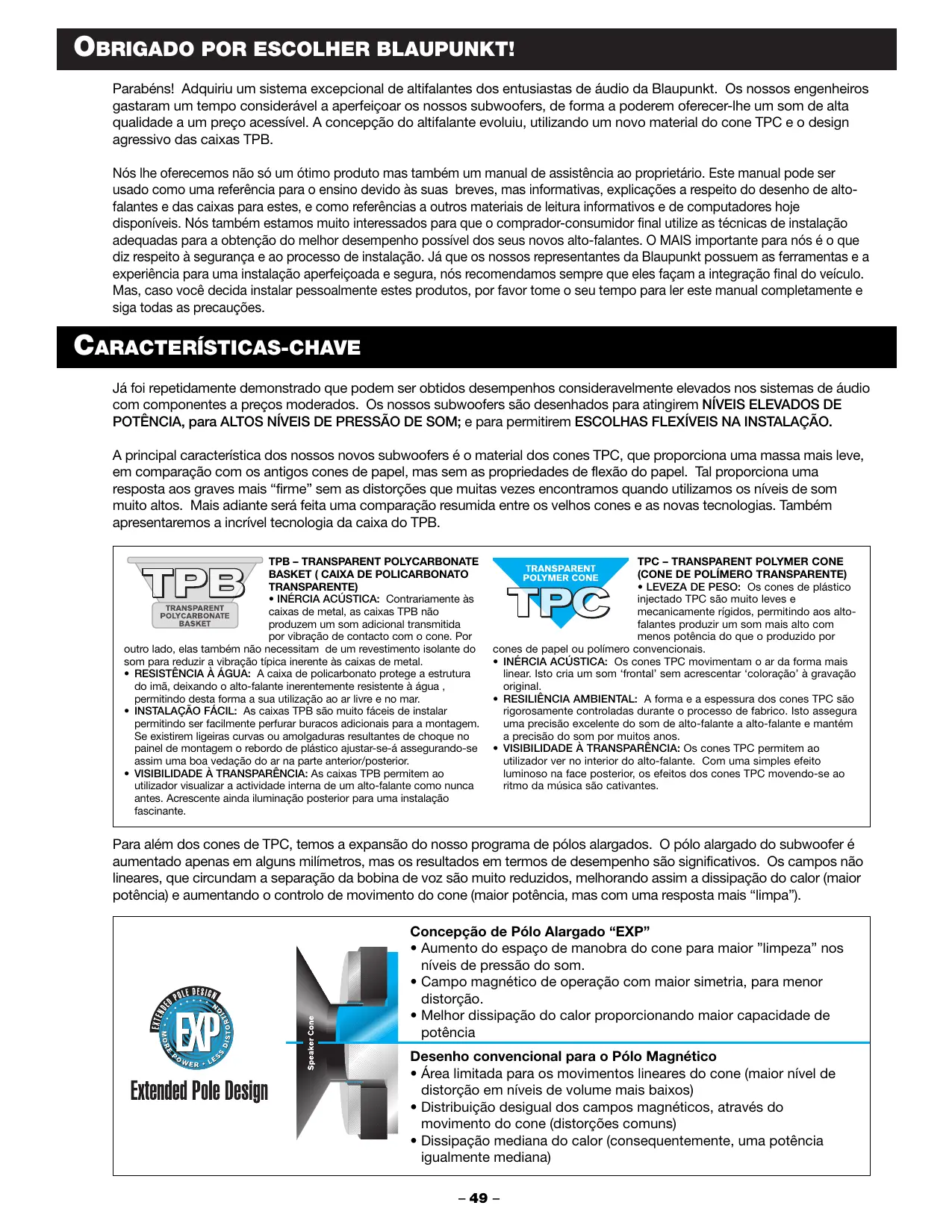 OBRIGADO POR ESCOLHER BLAUPUNKT! Parabéns! Adquiriu um sistema excepcional de altifalantes dos entusiastas de áudio da Blaupunkt. Os nossos engenheiros gastaram um tempo considerável a aperfeiçoar os nossos subwoofers, de forma a poderem oferecer-lhe um som de alta qualidade a um preço acessível. A concepção do altifalante evoluiu, utilizando um novo material do cone TPC e o design agressivo das caixas TPB. Nós lhe oferecemos não só um ótimo produto mas também um manual de assistência ao proprietário. Este manual pode ser usado como uma referência para o ensino devido às suas breves, mas informativas, explicações a respeito do desenho de altofalantes e das caixas para estes, e como referências a outros materiais de leitura informativos e de computadores hoje disponíveis. Nós também estamos muito interessados para que o comprador-consumidor final utilize as técnicas de instalação adequadas para a obtenção do melhor desempenho possível dos seus novos alto-falantes. O MAIS importante para nós é o que diz respeito à segurança e ao processo de instalação. Já que os nossos representantes da Blaupunkt possuem as ferramentas e a experiência para uma instalação aperfeiçoada e segura, nós recomendamos sempre que eles façam a integração final do veículo. Mas, caso você decida instalar pessoalmente estes produtos, por favor tome o seu tempo para ler este manual completamente e siga todas as precauções.