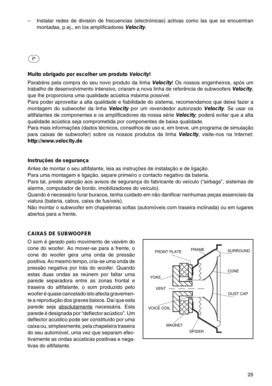 P Muito obrigado por escolher um produto Velocity! Parabéns pela compra do seu novo produto da linha Velocity! Os nossos engenheiros, após um trabalho de desenvolvimento intensivo, criaram a nova linha de referência de subwoofers Velocity, que lhe proporciona uma qualidade acústica máxima possível. Para poder aproveitar a alta qualidade e fiabilidade do sistema, recomendamos que deixe fazer a montagem do subwoofer da linha Velocity por um revendedor autorizado Velocity. Se usar os altifalantes de componentes e os amplificadores da nossa série Velocity, poderá evitar que a alta qualidade acústica seja comprometida por componentes de baixa qualidade. Para mais informações (dados técnicos, conselhos de uso e, em breve, um programa de simulação para caixas de subwoofer) sobre os nossos produtos da linha Velocity, visite-nos na Internet: http://www.velocity.de
