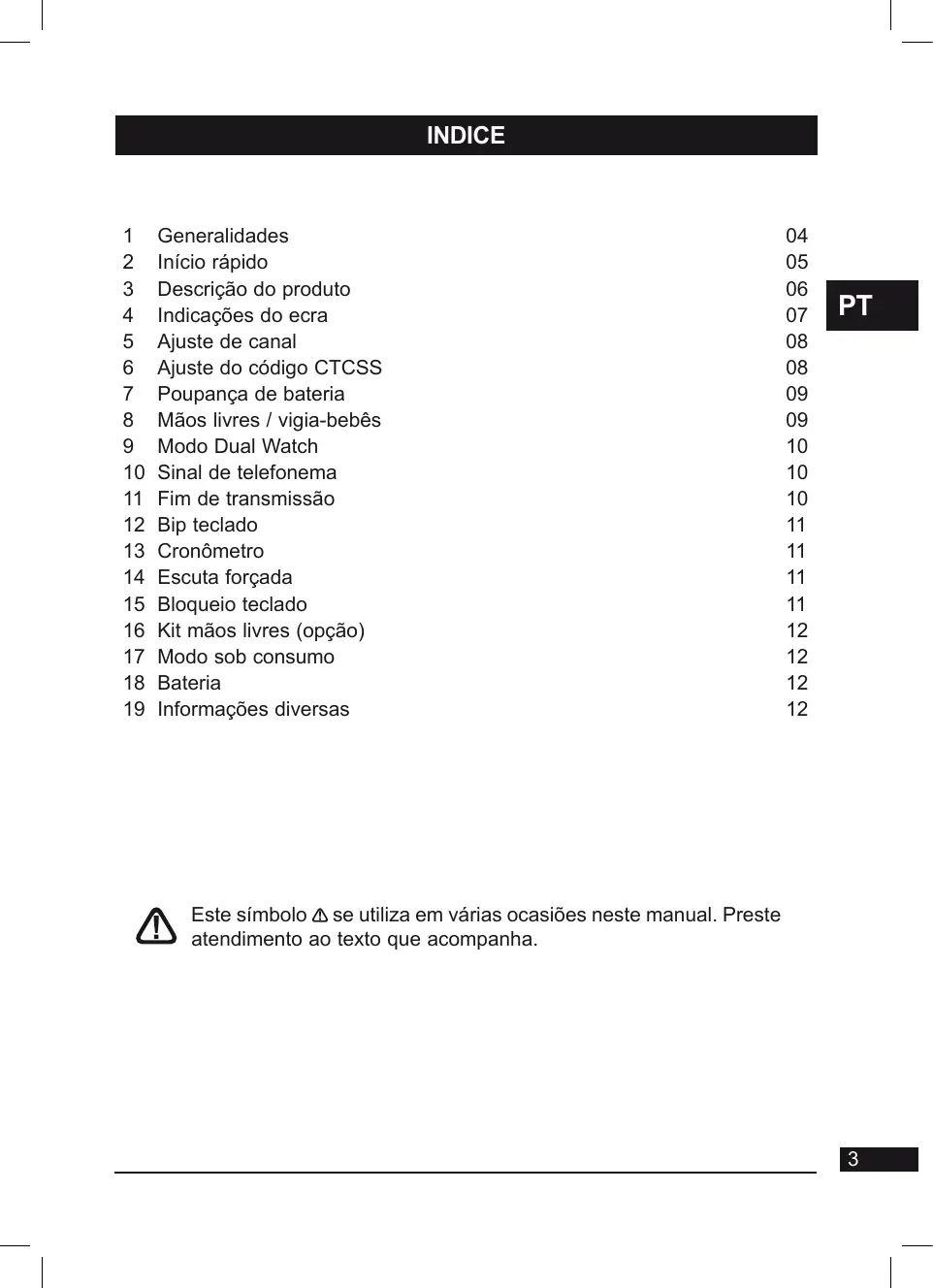 Generalidades Início rápido Descrição do produto Indicações do ecra Ajuste de canal Ajuste do código CTCSS Poupança de bateria Mãos livres / vigia-bebês Modo Dual Watch Sinal de telefonema Fim de transmissão Bip teclado Cronômetro Escuta forçada Bloqueio teclado Kit mãos livres (opção) Modo sob consumo Bateria Informações diversas