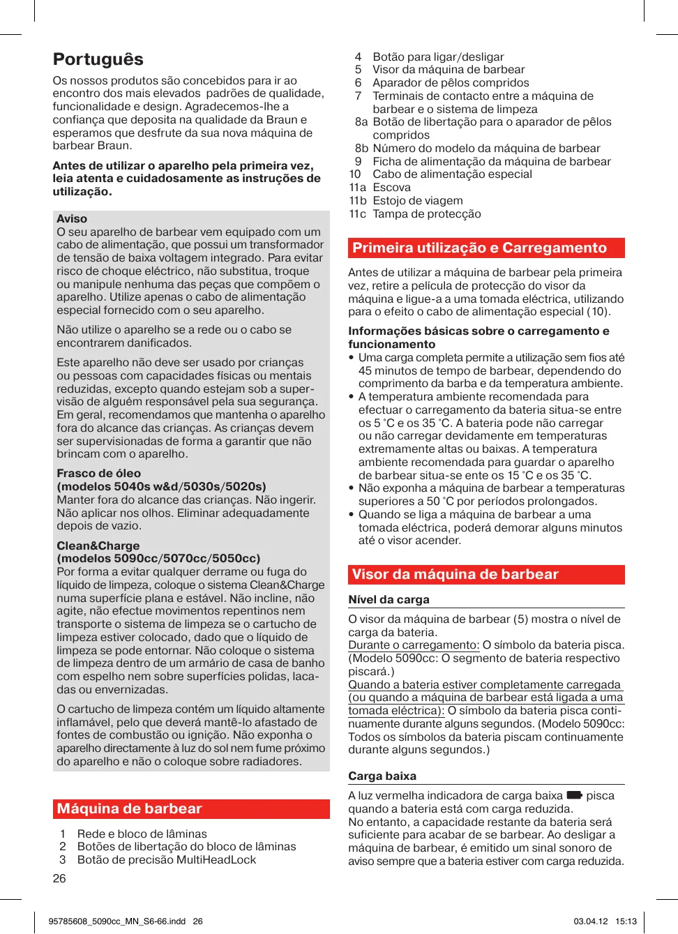 Português Os nossos produtos são concebidos para ir ao encontro dos mais elevados padrões de qualidade, funcionalidade e design. Agradecemos-lhe a confiança que deposita na qualidade da Braun e esperamos que desfrute da sua nova máquina de barbear Braun. Antes de utilizar o aparelho pela primeira vez, leia atenta e cuidadosamente as instruções de utilização. Aviso O seu aparelho de barbear vem equipado com um cabo de alimentação, que possui um transformador de tensão de baixa voltagem integrado. Para evitar risco de choque eléctrico, não substitua, troque ou manipule nenhuma das peças que compõem o aparelho. Utilize apenas o cabo de alimentação especial fornecido com o seu aparelho. Não utilize o aparelho se a rede ou o cabo se encontrarem danificados. Este aparelho não deve ser usado por crianças ou pessoas com capacidades físicas ou mentais reduzidas, excepto quando estejam sob a supervisão de alguém responsável pela sua segurança. Em geral, recomendamos que mantenha o aparelho fora do alcance das crianças. As crianças devem ser supervisionadas de forma a garantir que não brincam com o aparelho. Frasco de óleo (modelos 5040s w&d/5030s/5020s) Manter fora do alcance das crianças. Não ingerir. Não aplicar nos olhos. Eliminar adequadamente depois de vazio. Clean&Charge (modelos 5090cc/5070cc/5050cc) Por forma a evitar qualquer derrame ou fuga do líquido de limpeza, coloque o sistema Clean&Charge numa superfície plana e estável. Não incline, não agite, não efectue movimentos repentinos nem transporte o sistema de limpeza se o cartucho de limpeza estiver colocado, dado que o líquido de limpeza se pode entornar. Não coloque o sistema de limpeza dentro de um armário de casa de banho com espelho nem sobre superfícies polidas, lacadas ou envernizadas. O cartucho de limpeza contém um líquido altamente inflamável, pelo que deverá mantê-lo afastado de fontes de combustão ou ignição. Não exponha o aparelho directamente à luz do sol nem fume próximo do aparelho e não o coloque sobre radiadores. Máquina de barbear 1 Rede e bloco de lâminas 2 Botões de libertação do bloco de lâminas 3 Botão de precisão MultiHeadLock