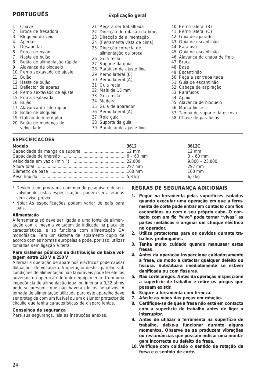 19 Déclencheur du commutateur 38 Support du guide 58 Tournevis SPECIFICATIONS Modèle 3612 3612C Capacité de pince 12 mm 12 mm Capacité de plongée 0- 60 mm 0- 60 mm Vitesse à vide (min 2) . 22 000 9 000 - 23 000 Hauteur hors tout 297 mm 297 mm Diamètre du socle 160 mm 160 mm tique, et il ne pourra fonctionner que sur un courant