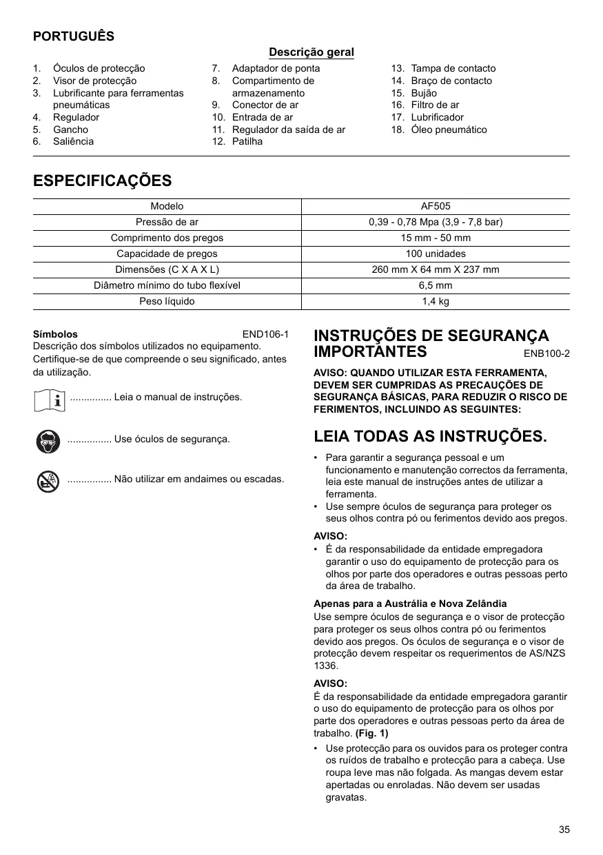 Use sempreóculos de segurar e o visor de proteção para proteger os seu olhos contra pô ou ferimentos devido aos pregos. Osóculos de segurar e o visor de proteção devem respeitar osrequireimentos de AS/NZS 1336.