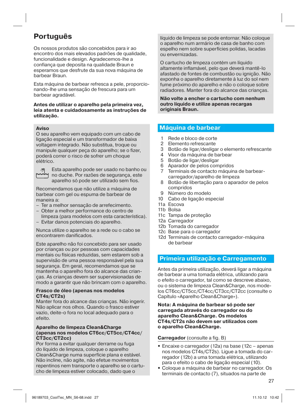 Português Os nossos produtos são concebidos para ir ao encontro dos mais elevados padrões de qualidade, funcionalidade e design. Agradecemos-lhe a confiança que deposita na qualidade Braun e esperamos que desfrute da sua nova máquina de barbear Braun. Esta máquina de barbear refresca a pele, proporcionando-lhe uma sensação de frescura para um barbear agradável. Antes de utilizar o aparelho pela primeira vez, leia atenta e cuidadosamente as instruções de utilização. Aviso O seu aparelho vem equipado com um cabo de ligação especial e um transformador de baixa voltagem integrado. Não substitua, troque ou manipule qualquer peça do aparelho; se o fizer, poderá correr o risco de sofrer um choque elétrico. Esta aparelho pode ser usado no banho ou no duche. Por razões de segurança, este aparelho só pode ser utilizado sem fios. Recomendamos que não utilize a máquina de barbear com gel ou espuma de barbear de maneira a: – Ter a melhor sensação de arrefecimento. – Obter a melhor performance do centro de limpeza (para modelos com esta característica). – Evitar danos potenciais do aparelho. Nunca utilize o aparelho se a rede ou o cabo se encontrarem danificados. Este aparelho não foi concebido para ser usado por crianças ou por pessoas com capacidades mentais ou físicas reduzidas, sem estarem sob a supervisão de uma pessoa responsável pela sua segurança. Em geral, recomendamos que se mantenha o aparelho fora do alcance das crianças. As crianças devem ser supervisionadas de modo a garantir que não brincam com o aparelho. Frasco de óleo (apenas nos modelos CT4s/CT2s) Manter fora do alcance das crianças. Não ingerir. Não aplicar nos olhos. Quando o frasco estiver vazio, deite-o fora no local adequado para o efeito. Aparelho de limpeza Clean&Charge (apenas nos modelos CT6cc/CT5cc/CT4cc/ CT3cc/CT2cc) Por forma a evitar qualquer derrame ou fuga do líquido de limpeza, coloque o aparelho Clean&Charge numa superfície plana e estável. Não incline, não agite, não efetue movimentos repentinos nem transporte o aparelho se o cartucho de limpeza estiver colocado, dado que o líquido de limpeza se pode entornar. Não coloque o aparelho num armário de casa de banho com espelho nem sobre superfícies polidas, lacadas ou envernizadas. O cartucho de limpeza contém um líquido altamente inflamável, pelo que deverá mantê-lo afastado de fontes de combustão ou ignição. Não exponha o aparelho diretamente à luz do sol nem fume próximo do aparelho e não o coloque sobre radiadores. Manter fora do alcance das crianças. Não volte a encher o cartucho com nenhum outro líquido e utilize apenas recargas originais Braun. Máquina de barbear