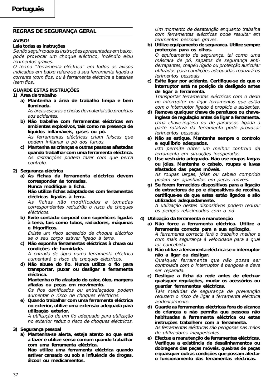 Um momento de desatenção quando travaça com ferramentas electricas pode resultar em ferimentos pessoas graves.