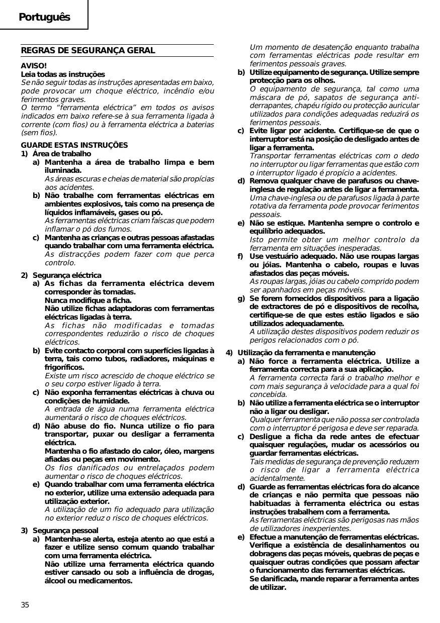 AVISO! Leia todas as instruções Se não seguir todas as instruções apresentadas em baixo, pode provocar um choque eléctrico, incêndio e/ou ferimentos graves. O termo “ferramenta eléctrica” em todos os avisos indicados em baixo refere-se à sua ferramenta ligada à corrente (com fios) ou à ferramenta eléctrica a baterias (sem fios).