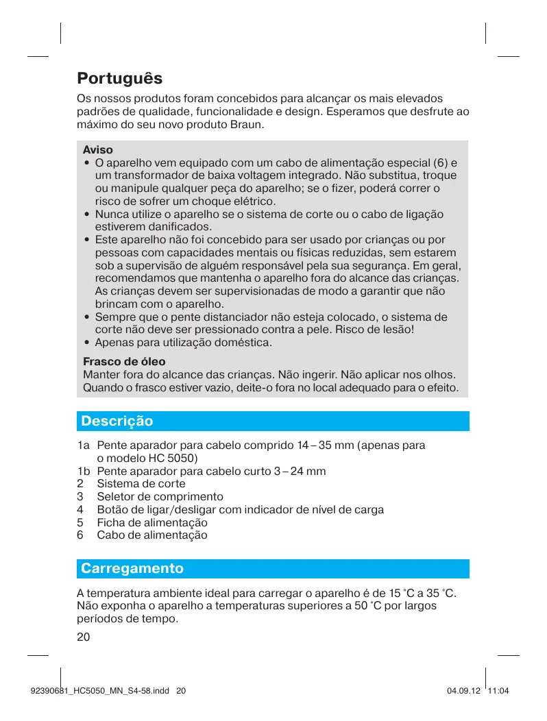 • El pelo debe estar limpio, bien peinado, seco y sin enredos. Técnica de Braun más cercano: www.service.braun.com. Solo para España Servicio al consumidor: Para localizar a su Servicio Braun más cercano o en el caso de que tenga Vd. alguna duda referente al funcionamiento de este producto, le rogamos contacte con el teléfono de este servicio 901 11 61 84. 19 5 Ficha de alimentação 6 Cabo de alimentação