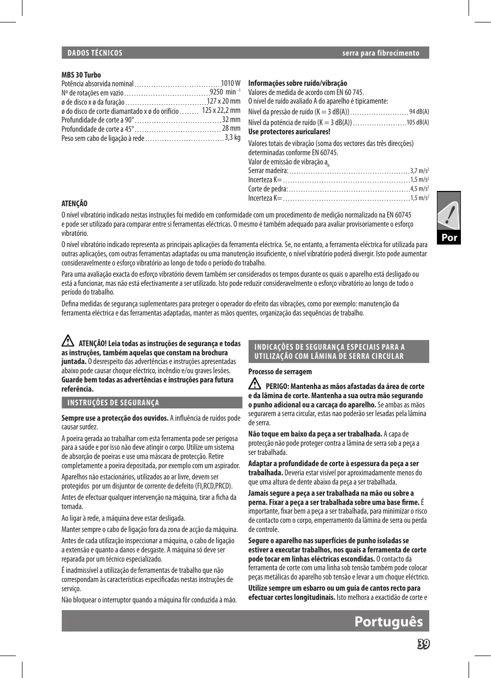 MBS 30 Turbo Poténcia absorvida nominal 1010W Informaçôes sobre ruido/vibraçäo No de rotaçôes em vazio 9250 min‘ Valores de medida de acordo com EN 60 745. 9 de disco x 0 da furaçäo 127120 mm 0 nivel de ruidoavaliado À do aparelho 6 tipicamente: 9 do disco de corte diamantado x do orfdo.…… 125x22,2mm Nivel da pressé deruido (K = 3 dB(A)) 4484) ont --32mmM Nivel da poténcia de rudo {K = 3 dB(A)) 105 A) Profundidade de corte 45 26mm | use protectores auriculares! Peso sem cabo de ligaçäo à rede 33kg Valoestotais de vibraçéo {soma dos vectoes ds très direcçôes) determinadas conforme EN 60745. Var deemisdo devbtie, Serrar madeira: 37m IncertezaK= 15m Corte de pedra: 45m IncertezaK= 15m ATENÇAO Onivel vibratérioindicado nestas instrugôes foi medido em conformidade com um procedimento de mediçäo normalizado na EN 60745 € pode serutlizado para comparar entre si ferramentas eléctricas, 0 mesmo étambém adequado para avaliarprovisoriamente 0 esforço vibratôrio. Onivelvibretérioindicado representa as principais aplicagôes da feramenta eléctrica. Se, no entanto, a ferramenta eléctrica for utilizada para outras aplicaçôes, com outrasferramentas adaptadas ou uma manutençäo insuficinte, nivel vibratéro poderà divergir. Iso pode aumentar consideravelmente 0 esfrço vibratéri ao longo de todo o periodo do trabalho. Para uma avaliaçäo exacta do esforço ibratério devem também ser considerados os tempos durante os quais o aparelho esté desligado où esté a fundonar, mas nâo esté efectivamente a ser utlzado. Isto pode reduzir consideravelmente o esforço vibratério ao longo de todo 0 periodo do trabalho Defina medidas de segurança suplementares para proteger 0 aperador do felto das vibragGes, como por exemplo: manutençéo da ferramenta eléctrica € das ferramentas adaptadas, manter as mâos quentes, organizaçäo das sequénias de trabalho. VAN ATENÇAO! Leia todas as instruçôes de segurança e todas as instruçôes, também aquelas que constam na brochura juntada. 0 desrespeit das adverténcas instruçôes apresentadas abaïxo pode œusar choque eléctico incéndio e/ou graves lesôes. Guarde bem todas as adverténcias e instruçôes para futura referéncia.