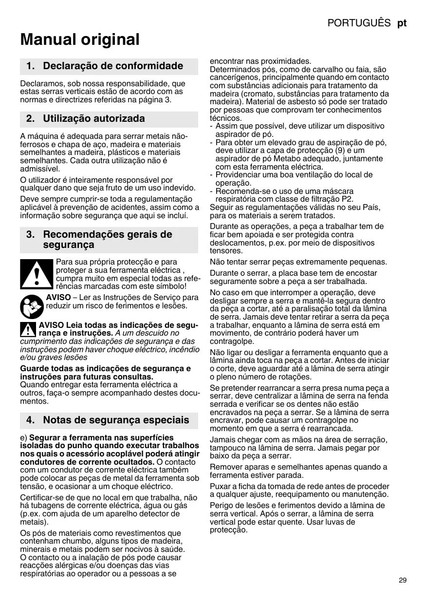 A méquina é adequada para serrar metais näo- ferrosos e chapa de aço, madeira e materiais semelhantes a madeira, plésticos e materiais semelhantes. Cada outra utilizaçäo näo é admissivel. O utilizador é inteiramente responsävel por qualquer dano que seja fruto de um uso indevido. Deve sempre cumprir-se toda a regulamentaçäo aplicävel à prevençäo de acidentes, assim como a informaçäo sobre Segurança que aqui se inclui.