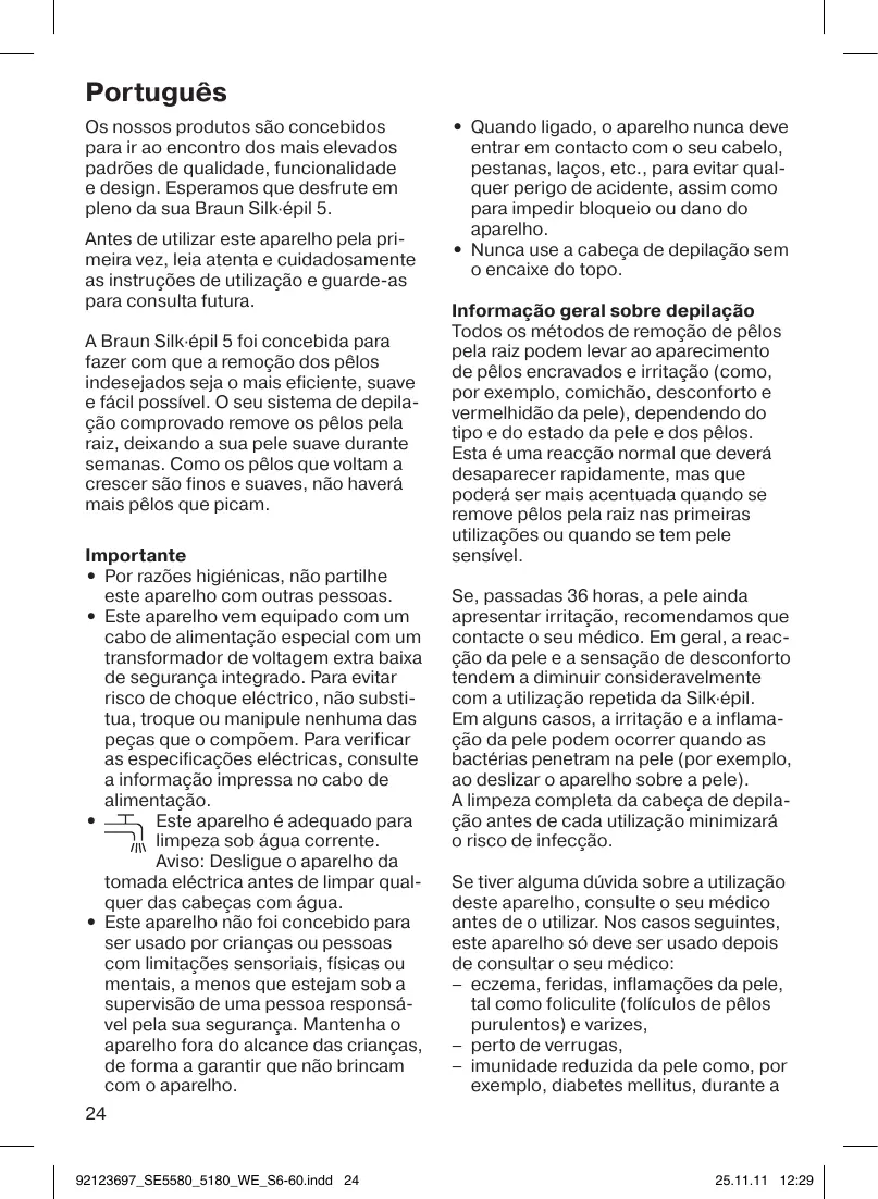 Português Os nossos produtos são concebidos para ir ao encontro dos mais elevados padrões de qualidade, funcionalidade e design. Esperamos que desfrute em pleno da sua Braun Silk·épil 5. Antes de utilizar este aparelho pela primeira vez, leia atenta e cuidadosamente as instruções de utilização e guarde-as para consulta futura. A Braun Silk·épil 5 foi concebida para fazer com que a remoção dos pêlos indesejados seja o mais eficiente, suave e fácil possível. O seu sistema de depilação comprovado remove os pêlos pela raiz, deixando a sua pele suave durante semanas. Como os pêlos que voltam a crescer são finos e suaves, não haverá mais pêlos que picam. Importante