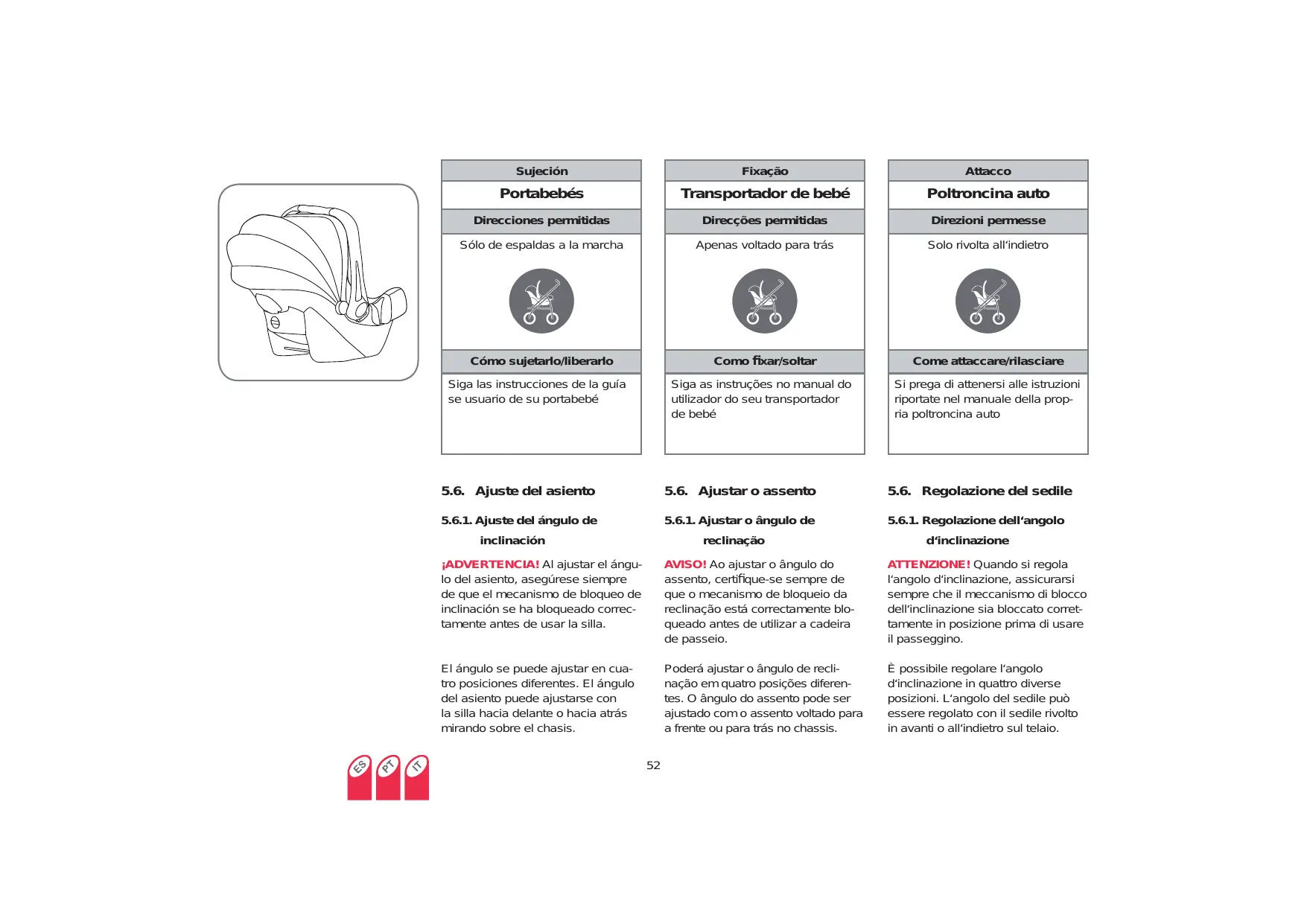 Una poltroncina auto deve essere usata solo rivolta all‘indietro sul passeggino. Se si usa come struttura di trasporto, si prega di seguire le istruzioni per la propria poltroncina.