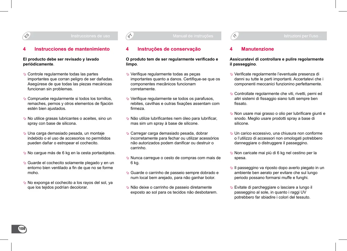ÞÞ Controllate regolarmente che viti, rivetti, perni ed altri sistemi di fissaggio siano tutti sempre ben fissato. ÞÞ Non usare mai grasso o olio per lubrificare giunti e snodo. Meglio usare prodotti spray a base di silicone. ÞÞ Un carico eccessivo, una chiusura non conforme o l’utilizzo di accessori non omologati potrebbero danneggiare o distruggere il passeggino. ÞÞ Non caricate mai più di 6 kg nel cestino per la spesa. ÞÞ Il passeggino va riposto dopo averlo piegato in un ambiente ben aerato per evitare che sul lungo periodo possano formarsi muffe e funghi. ÞÞ Evitate di parcheggiare o lasciare a lungo il passeggino al sole, in quanto i raggi UV potrebbero far sbiadire i colori del tessuto.