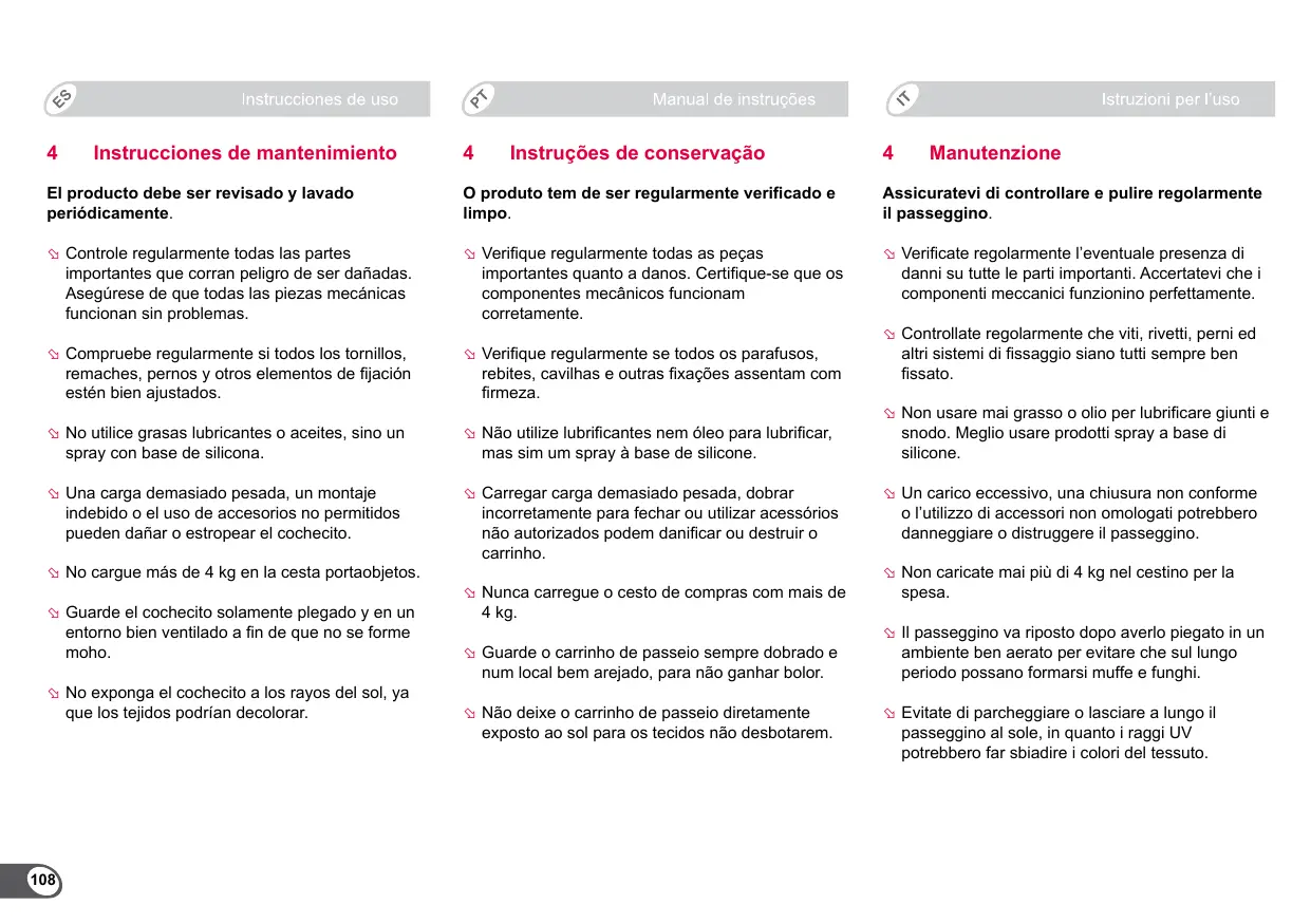 ÞÞ Controllate regolarmente che viti, rivetti, perni ed altri sistemi di fissaggio siano tutti sempre ben fissato. ÞÞ Non usare mai grasso o olio per lubrificare giunti e snodo. Meglio usare prodotti spray a base di silicone. ÞÞ Un carico eccessivo, una chiusura non conforme o l’utilizzo di accessori non omologati potrebbero danneggiare o distruggere il passeggino. ÞÞ Non caricate mai più di 4 kg nel cestino per la spesa. ÞÞ Il passeggino va riposto dopo averlo piegato in un ambiente ben aerato per evitare che sul lungo periodo possano formarsi muffe e funghi. ÞÞ Evitate di parcheggiare o lasciare a lungo il passeggino al sole, in quanto i raggi UV potrebbero far sbiadire i colori del tessuto.