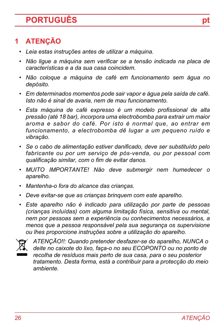 - Esta máquina de café expresso é um modelo profissional de alta pressão (até 18 bar), incorpora uma electrobomba para extrair um maior aroma e sabor do café. Por isto é normal que, ao entrar em funcionamento, a electrobomba dê lugar a um pequeno ruído e vibração.