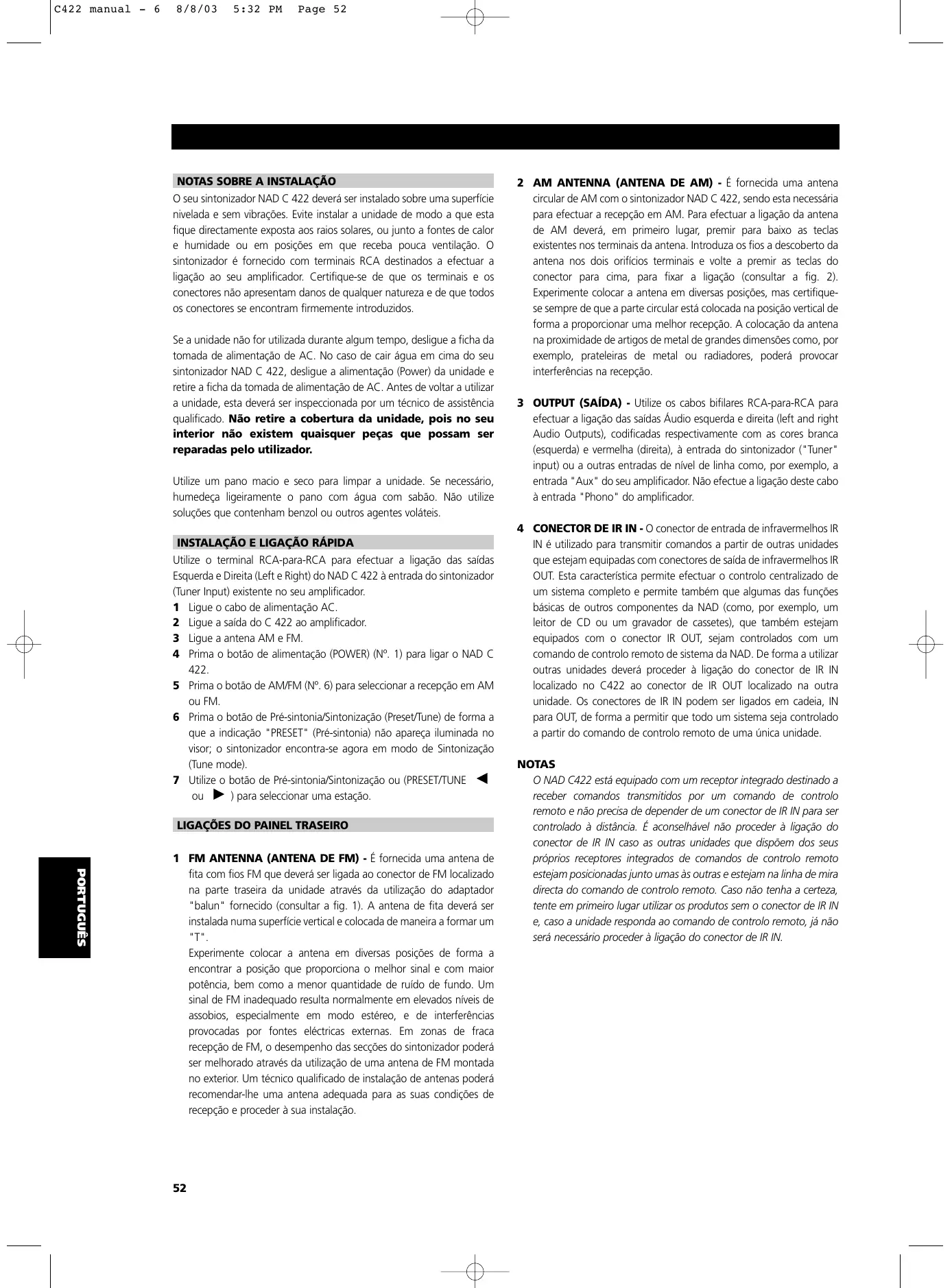 O seu sintonizador NAD C 422deer sa rster instalado sobreuma superficie nivelada e sem vibrações. Evite instalar a unidade de modo a que esta fique directamente exposta acos raios solares, ou junto a fontes de calor e humidade ou em posições em que receba pouca ventilação. O sintonizador é fornecido com terminais RCA destinados a efectuar a ligaçao ao seu amplificador. Certifique-se de que os terminais e os conectores não aparem danos de qualquer natureza e de que todos os conectores se encontrar firmamente introduzidos.