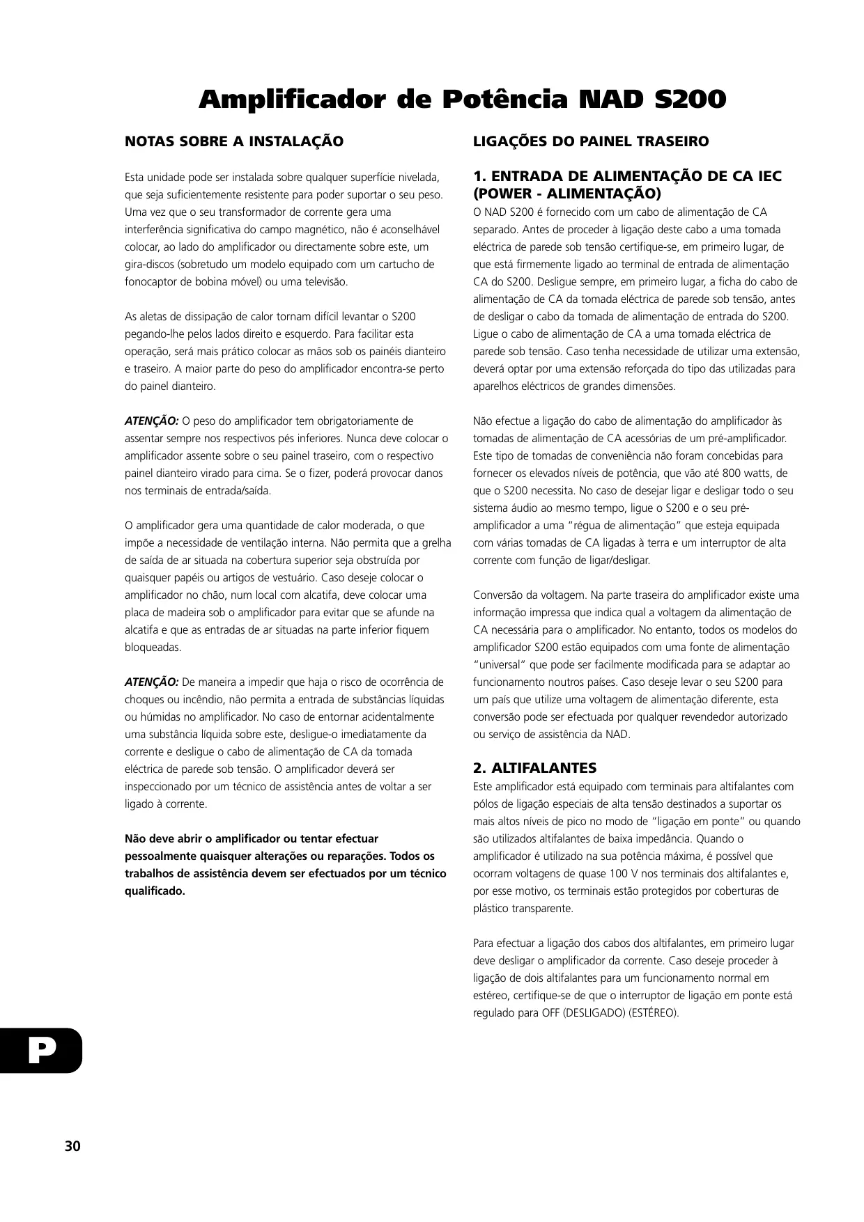 (POWER - ALIMENTAÇÃO) As aletas de dissipação de calor tornam difícil levantar o S200 pegando-lhe pelos lados direito e esquerdo. Para facilitar esta operação, será mais prático colocar as mãos sob os painéis dianteiro e traseiro. A maior parte do peso do amplificador encontra-se perto do painel dianteiro. ATENÇÃO: O peso do amplificador tem obrigatoriamente de assentar sempre nos respectivos pés inferiores. Nunca deve colocar o amplificador assente sobre o seu painel traseiro, com o respectivo painel dianteiro virado para cima. Se o fizer, poderá provocar danos nos terminais de entrada/saída. O amplificador gera uma quantidade de calor moderada, o que impõe a necessidade de ventilação interna. Não permita que a grelha de saída de ar situada na cobertura superior seja obstruída por quaisquer papéis ou artigos de vestuário. Caso deseje colocar o amplificador no chão, num local com alcatifa, deve colocar uma placa de madeira sob o amplificador para evitar que se afunde na alcatifa e que as entradas de ar situadas na parte inferior fiquem bloqueadas. ATENÇÃO: De maneira a impedir que haja o risco de ocorrência de choques ou incêndio, não permita a entrada de substâncias líquidas ou húmidas no amplificador. No caso de entornar acidentalmente uma substância líquida sobre este, desligue-o imediatamente da corrente e desligue o cabo de alimentação de CA da tomada eléctrica de parede sob tensão. O amplificador deverá ser inspeccionado por um técnico de assistência antes de voltar a ser ligado à corrente. Não deve abrir o amplificador ou tentar efectuar pessoalmente quaisquer alterações ou reparações. Todos os trabalhos de assistência devem ser efectuados por um técnico qualificado. O NAD S200 é fornecido com um cabo de alimentação de CA separado. Antes de proceder à ligação deste cabo a uma tomada eléctrica de parede sob tensão certifique-se, em primeiro lugar, de que está firmemente ligado ao terminal de entrada de alimentação CA do S200. Desligue sempre, em primeiro lugar, a ficha do cabo de alimentação de CA da tomada eléctrica de parede sob tensão, antes de desligar o cabo da tomada de alimentação de entrada do S200. Ligue o cabo de alimentação de CA a uma tomada eléctrica de parede sob tensão. Caso tenha necessidade de utilizar uma extensão, deverá optar por uma extensão reforçada do tipo das utilizadas para aparelhos eléctricos de grandes dimensões. Não efectue a ligação do cabo de alimentação do amplificador às tomadas de alimentação de CA acessórias de um pré-amplificador. Este tipo de tomadas de conveniência não foram concebidas para fornecer os elevados níveis de potência, que vão até 800 watts, de que o S200 necessita. No caso de desejar ligar e desligar todo o seu sistema áudio ao mesmo tempo, ligue o S200 e o seu préamplificador a uma “régua de alimentação” que esteja equipada com várias tomadas de CA ligadas à terra e um interruptor de alta corrente com função de ligar/desligar. Conversão da voltagem. Na parte traseira do amplificador existe uma informação impressa que indica qual a voltagem da alimentação de CA necessária para o amplificador. No entanto, todos os modelos do amplificador S200 estão equipados com uma fonte de alimentação “universal” que pode ser facilmente modificada para se adaptar ao funcionamento noutros países. Caso deseje levar o seu S200 para um país que utilize uma voltagem de alimentação diferente, esta conversão pode ser efectuada por qualquer revendedor autorizado ou serviço de assistência da NAD.
