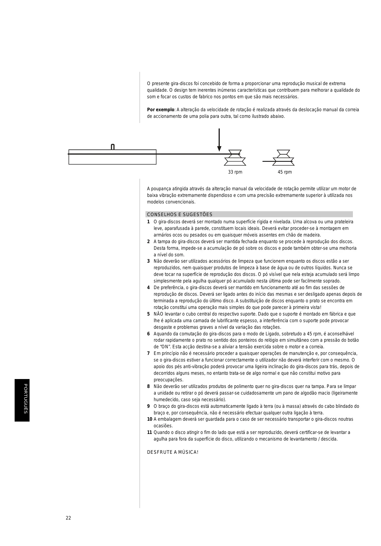 2 Dans la mesure du possible, le couvercle doit rester fermé pendant la lecture des disques. Cette précaution empêche la poussière de se déposer sur les disques et rend leur nettoyage inutile. Elle permet aussi d’améliorer la reproduction du son. 3 N’utilisez pas d’appareil qui nettoie les disques pendant la lecture, ni de dispositif de nettoyage qui fonctionne avec de l’eau ou un liquide quelconque. Ne touchez pas la surface de lecture des disques. Toute poussière visible à la surface du disque est simplement balayée par la pointe; en cas d’accumulation de poussières au niveau de la pointe, il suffit de la dégager en soufflant dessus. 4 Dans la mesure du possible, laissez tourner le plateau en permanence pendant une séance d’écoute de disques. Mettez l’appareil en marche avant de commencer et ne l’éteignez pas avant la fin du dernier disque. Changer un disque alors que le plateau tourne, ce n’est pas aussi facile que l’on puisse le penser ! 5 NE SOULEVEZ PAS l moyeu e central de son palier. Le palier a été assemblé chez le fabricant avec une couche de lubrifiant épais. Si vous dérangez cet assemblage, cela peut entraîner de graves problèmes d’usure et d’oscillations de vitesse. 6 Lorsque vous mettez la platine tourne-disques en marche, surtout à 45 tr/mn, il est recommandé de lancer manuellement le plateau dans le sens des aiguilles d’une montre au moment où vous appuyez sur le bouton “MARCHE”. En procédant ainsi, vous diminuerez les contraintes sur le moteur et la courroie. 7 Aucune maintenance n’est normalement nécessaire. Si la platine tourne-disques fonctionne correctement, ne touchez à rien. Après quelques mois, il se pourrait que les pieds antivibratoires se tassent un peu, faisant pencher la platine légèrement en arrière, mais cela ne doit susciter aucune inquiétude. 8 N’utilisez aucun produit pour nettoyer la platine ou son couvercle. Pour éliminer la poussière, essuyez doucement avec un chiffon doux (légèrement humecté si c’est vraiment nécessaire). 9 Le bras de lecture est automatiquement relié à la terre (ou à la masse) via le blindage du câble du bras. Aucune autre mise à la terre ne devrait être nécessaire. 10 Conservez les emballages, pour le cas où vous auriez besoin de transporter la platine tourne-disques à nouveau. 11 Lorsque vous avez fini d’écouter une face d’un disque, n’oubliez pas de relever la pointe de la surface du disque en vous servant du lève-bras. IL NE VOUS RESTE PLUS QU’À PROFITER DE LA MUSIQUE !