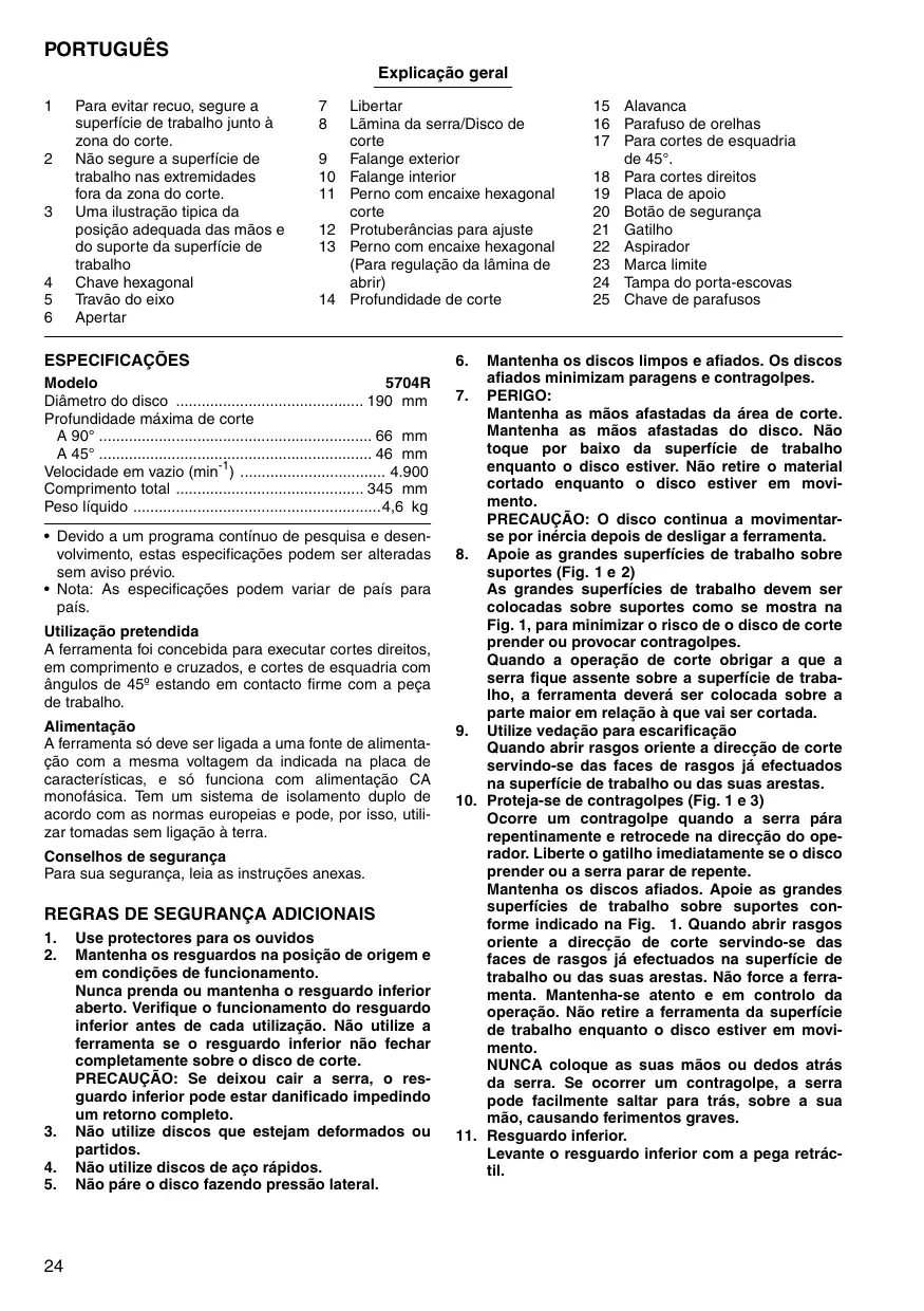 - Libertar Lãmina da serra/Disco de corte Falange exterior Falange interior Perno com encaixe hexagonal corte Protuberâncias para ajuste Perno com encaixe hexagonal (Para regulação da lâmina de abrir) Profundidade de corte ESPECIFICAÇÕES Modelo 5704R Diâmetro do disco p. 190