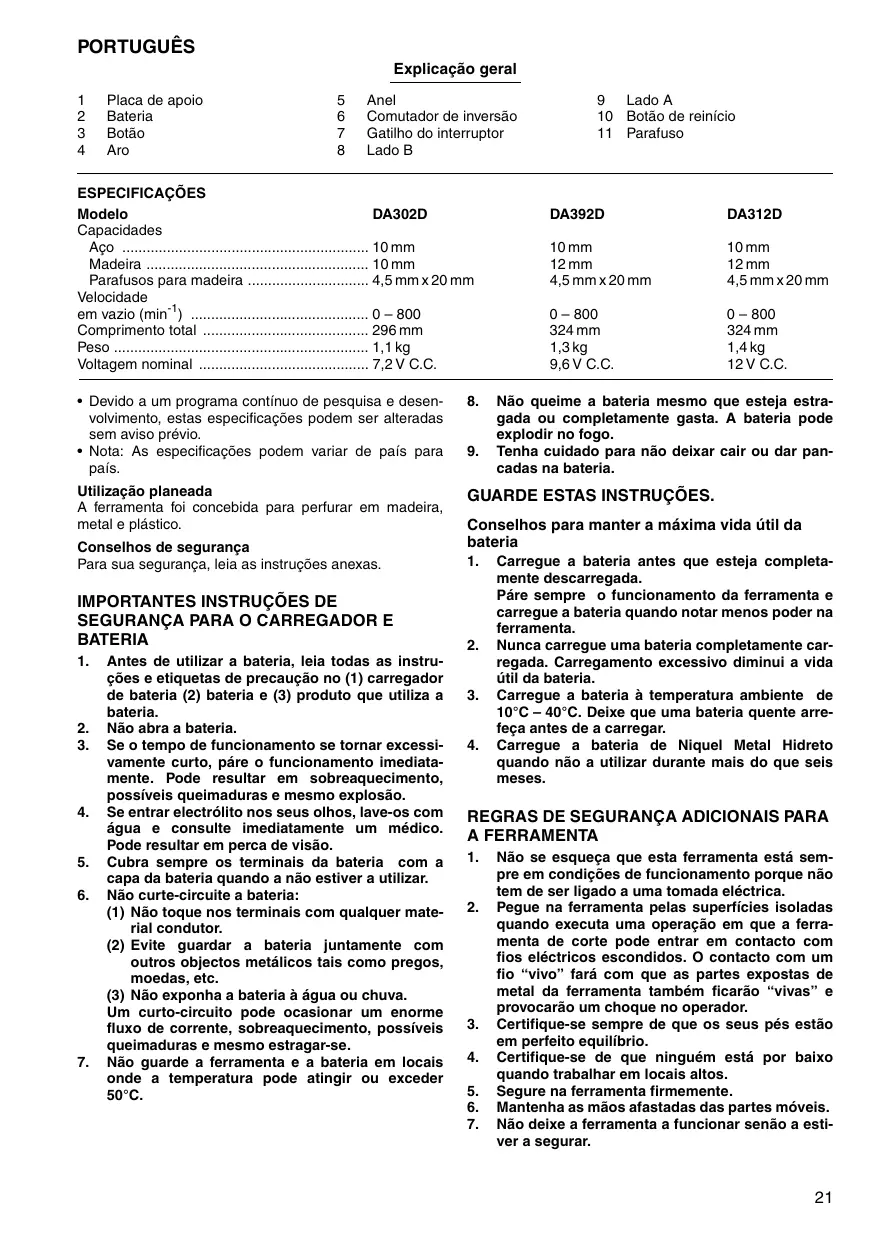 Carregue a bateria antes que esteja completamente descarregada. Páre sempre o funcionamento da ferramenta e carregue a bateria quando notar menos poder na ferramenta. Nunca carregue uma bateria completamente carregada. Carregamento excessivo diminui a vida útil da bateria. Carregue a bateria à temperatura ambiente de 10°C – 40°C. Deixe que uma bateria quente arrefeça antes de a carregar. Carregue a bateria de Niquel Metal Hidreto quando não a utilizar durante mais do que seis meses.
