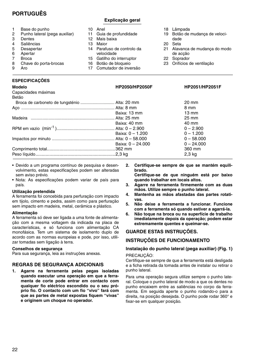 HP2051/HP2051F 20 mm 8 mm 13 mm 25 mm 40 mm 0 – 2.900 0 – 1.200 0 – 58.000 0 – 24.000 360 mm 2,3 kg Certifique-se sempre de que se mantém equilibrado. Certifique-se de que ninguém está por baixo quando trabalhar em locais altos. Agarre na ferramenta firmemente com as duas mãos. Utilize sempre o punho lateral. Mantenha as mãos afastadas das partes rotativas. Não deixe a ferramenta a funcionar. Funcione com a ferramenta só quando estiver a agarrá-la. Não toque na broca ou na superfície de trabalho imediatamente depois da operação; podem estar extremamente quentes e queimar-se. Alimentação A ferramenta só deve ser ligada a uma fonte de alimentação com a mesma voltagem da indicada na placa de características, e só funciona com alimentação CA monofásica. Tem um sistema de isolamento duplo de acordo com as normas europeias e pode, por isso, utilizar tomadas sem ligação à terra.