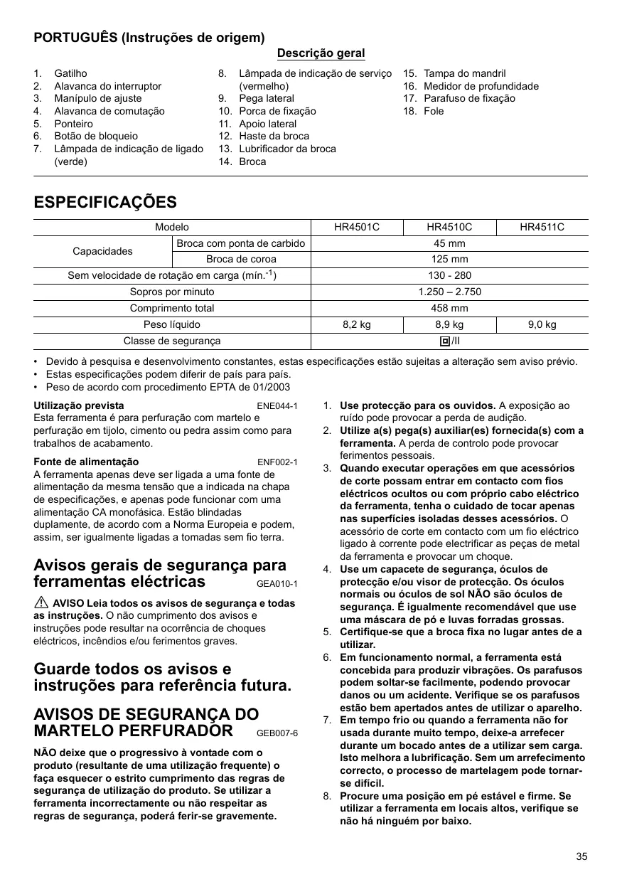 AVISOS DE SEGURANÇA DO MARTELO PERFURADOR GEB007-6