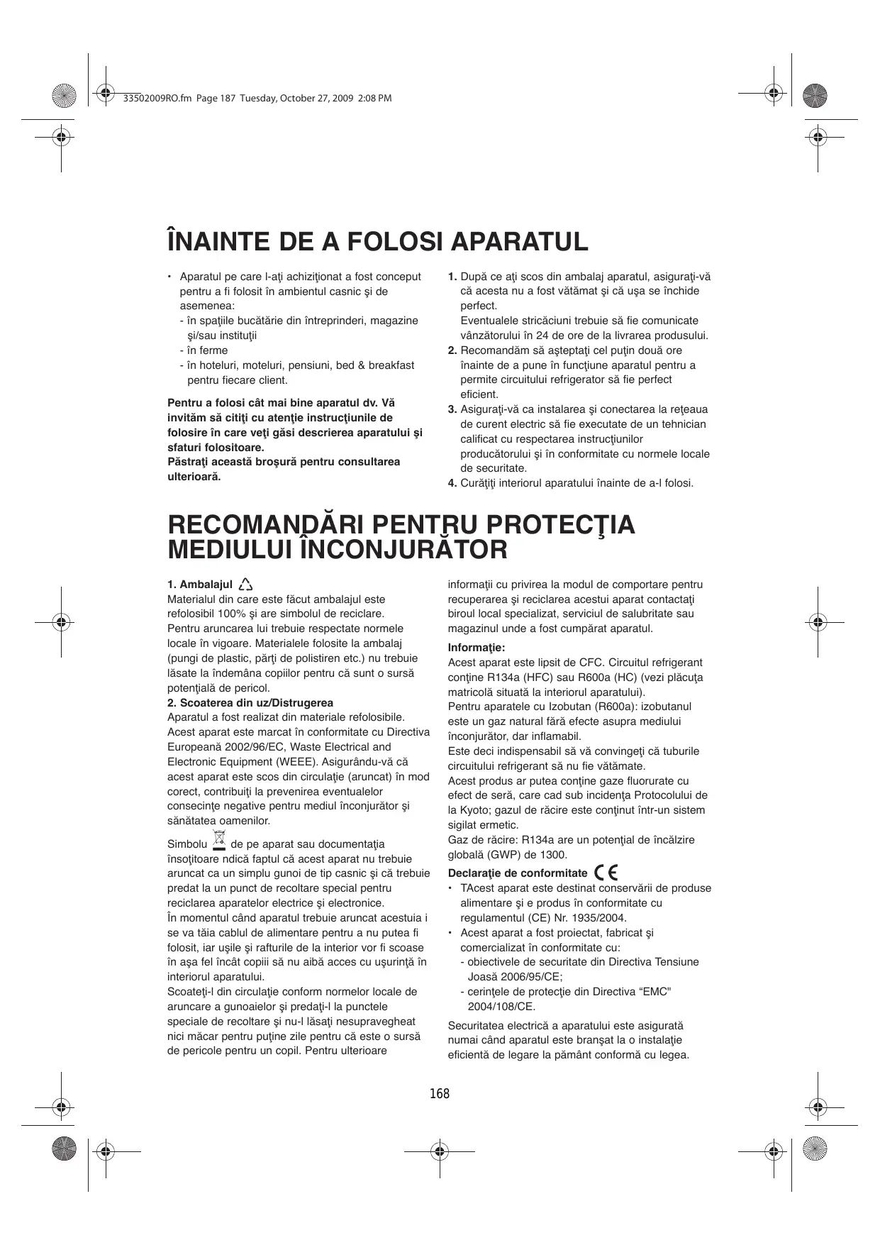 Aparatul a fost realizat din materiale refolosibile. Acest aparat este marcat în conformitate cu Directiva Europeană 2002/96/EC, Waste Electrical and Electronic Equipment (WEEE). Asigurându-vă că acest aparat este scos din circulaţie (aruncat) în mod corect, contribuiţi la prevenirea eventualelor consecinţe negative pentru mediul înconjurător şi sănătatea oamenilor. Simbolu de pe aparat sau documentaţia însoţitoare ndică faptul că acest aparat nu trebuie aruncat ca un simplu gunoi de tip casnic şi că trebuie predat la un punct de recoltare special pentru reciclarea aparatelor electrice şi electronice. În momentul când aparatul trebuie aruncat acestuia i se va tăia cablul de alimentare pentru a nu putea fi folosit, iar uşile şi rafturile de la interior vor fi scoase în aşa fel încât copiii să nu aibă acces cu uşurinţă în interiorul aparatului. Scoateţi-l din circulaţie conform normelor locale de aruncare a gunoaielor şi predaţi-l la punctele speciale de recoltare şi nu-l lăsaţi nesupravegheat nici măcar pentru puţine zile pentru că este o sursă de pericole pentru un copil. Pentru ulterioare informaţii cu privirea la modul de comportare pentru recuperarea şi reciclarea acestui aparat contactaţi biroul local specializat, serviciul de salubritate sau magazinul unde a fost cumpărat aparatul. Informaţie: Acest aparat este lipsit de CFC. Circuitul refrigerant conţine R134a (HFC) sau R600a (HC) (vezi plăcuţa matricolă situată la interiorul aparatului). Pentru aparatele cu Izobutan (R600a): izobutanul este un gaz natural fără efecte asupra mediului înconjurător, dar inflamabil. Este deci indispensabil să vă convingeţi că tuburile circuitului refrigerant să nu fie vătămate. Acest produs ar putea conţine gaze fluorurate cu efect de seră, care cad sub incidenţa Protocolului de la Kyoto; gazul de răcire este conţinut într-un sistem sigilat ermetic. Gaz de răcire: R134a are un potenţial de încălzire globală (GWP) de 1300. Declaraţie de conformitate