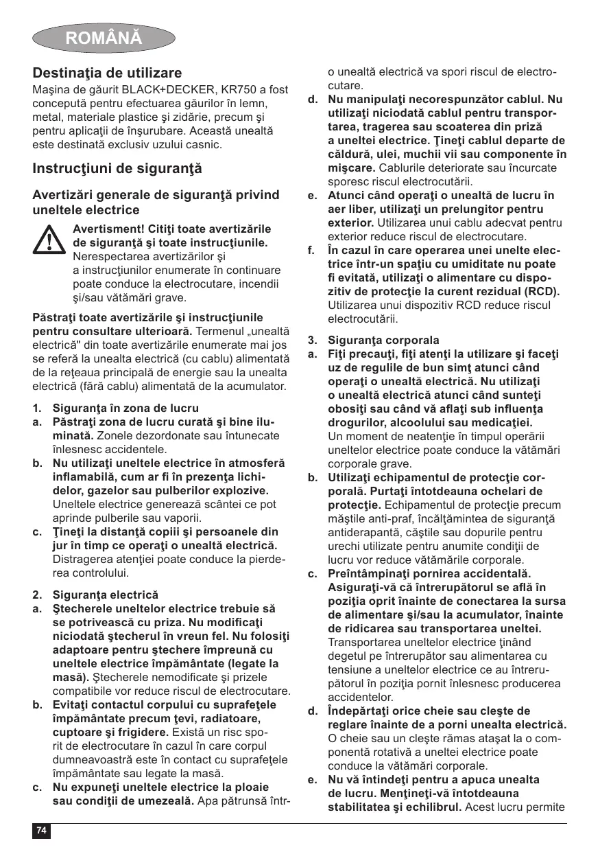 ROMÂNĂ Destinaţia de utilizare Maşina de găurit BLACK+DECKER, KR750 a fost concepută pentru efectuarea găurilor în lemn, metal, materiale plastice şi zidărie, precum şi pentru aplicaţii de înşurubare. Această unealtă este destinată exclusiv uzului casnic. Instrucţiuni de siguranţă Avertizări generale de siguranţă privind uneltele electrice Avertisment! Citiţi toate avertizările de siguranţă şi toate instrucţiunile. Nerespectarea avertizărilor şi a instrucţiunilor enumerate în continuare poate conduce la electrocutare, incendii şi/sau vătămări grave. Păstraţi toate avertizările şi instrucţiunile pentru consultare ulterioară. Termenul „unealtă electrică" din toate avertizările enumerate mai jos se referă la unealta electrică (cu cablu) alimentată de la reţeaua principală de energie sau la unealta electrică (fără cablu) alimentată de la acumulator.