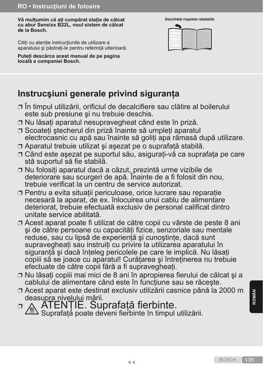 BOSCH RO • Instrucţiuni de folosire Vă mulţumim că aţi cumpărat staţia de călcat cu abur Sensixx B22L, noul sistem de călcat de la Bosch. Deschideţi clapetele rabatabile Citiţi cu atenţie instrucţiunile de utilizare a aparatului şi păstraţi-le pentru referinţă ulterioară. Puteţi descărca acest manual de pe pagina locală a companiei Bosch. Instrucşiuni generale privind siguranţa ❐❐ În timpul utilizării, orificiul de decalcifiere sau clătire al boilerului este sub presiune şi nu trebuie deschis. ❐❐ Nu lăsaţi aparatul nesupravegheat când este în priză. ❐❐ Scoateţi ştecherul din priză înainte să umpleţi aparatul electrocasnic cu apă sau înainte să goliţi apa rămasă după utilizare. ❐❐ Aparatul trebuie utilizat şi aşezat pe o suprafaţă stabilă. ❐❐ Când este aşezat pe suportul său, asiguraţi-vă ca suprafaţa pe care stă suportul să fie stabilă. deteriorare sau scurgeri de apă. Înainte de a fi folosit din nou, trebuie verificat la un centru de service autorizat. ❐❐ Pentru a evita situaţii periculoase, orice lucrare sau reparaţie necesară la aparat, de ex. înlocuirea unui cablu de alimentare deteriorat, trebuie efectuată exclusiv de personal calificat dintro unitate service abilitată. ❐❐ Acest aparat poate fi utilizat de către copii cu vârste de peste 8 ani şi de către persoane cu capacităţi fizice, senzoriale sau mentale reduse, sau cu lipsă de experienţă şi cunoştinţe, dacă sunt supravegheaţi sau instruiţi cu privire la utilizarea aparatului în siguranţă şi dacă înţeleg pericolele pe care le implică. Nu lăsaţi copiii să se joace cu aparatul! Curăţarea şi întreţinerea nu trebuie efectuate de către copii fără a fi supravegheaţi. ❐❐ Nu lăsaţi copiii mai mici de 8 ani în apropierea fierului de călcat şi a cablului de alimentare când este în funcţiune sau se răceşte. ❐❐ Acest aparat este destinat exclusiv utilizării casnice până la 2000 m deasupra nivelului mării.