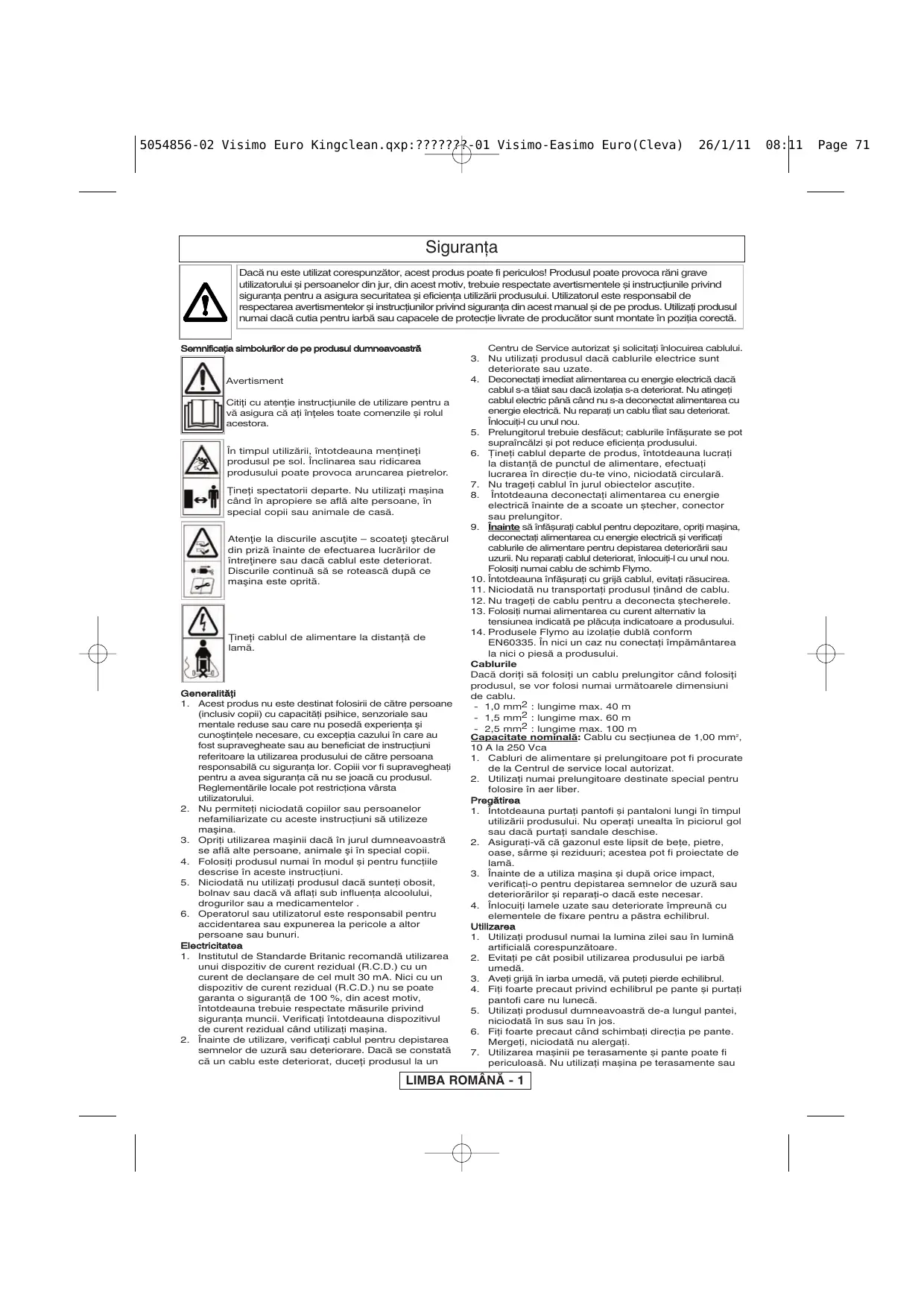 08:11 Page 70 5054856-02 Visimo Euro Kingclean.qxp:???????-01 Visimo-Easimo Euro(Cleva) 26/1/11 Siguranţa Dacă nu este utilizat corespunzător, acest produs poate fi periculos! Produsul poate provoca răni grave utilizatorului și persoanelor din jur, din acest motiv, trebuie respectate avertismentele și instrucţiunile privind siguranţa pentru a asigura securitatea și eficienţa utilizării produsului. Utilizatorul este responsabil de respectarea avertismentelor și instrucţiunilor privind siguranţa din acest manual și de pe produs. Utilizaţi produsul numai dacă cutia pentru iarbă sau capacele de protecţie livrate de producător sunt montate în poziţia corectă. Semnificaţia simbolurilor de pe produsul dumneavoastră Avertisment Citiţi cu atenţie instrucţiunile de utilizare pentru a vă asigura că aţi înţeles toate comenzile și rolul acestora. În timpul utilizării, întotdeauna menţineţi produsul pe sol. Înclinarea sau ridicarea produsului poate provoca aruncarea pietrelor. Ţineţi spectatorii departe. Nu utilizaţi mașina când în apropiere se află alte persoane, în special copii sau animale de casă. Atenţie la discurile ascuţite – scoateţi ştecărul din priză înainte de efectuarea lucrărilor de întreţinere sau dacă cablul este deteriorat. Discurile continuă să se rotească după ce maşina este oprită. Ţineţi cablul de alimentare la distanţă de lamă. Generalităţi