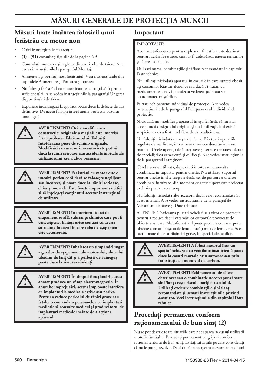 AVERTISMENT! A folosi motorul într-un spaöiu închis sau cu ventilaöie insuficientã poate duce la cazuri mortale prin sufocare sau prin intoxicaöie cu monoxid de carbon. AVERTISMENT! Echipamentul de tãiere deteriorat sau o combinaöie necorespunzãtoare äinã/lanö creäte riscul apariöiei reculului. Utilizaöi exclusiv combinaöiile äinã/lanö recomandate äi urmaöi instrucöiunile privind ascuöirea. Vezi instrucöiunile din capitolul Date tehnice. Procedaöi permanent conform raöionamentului de bun simö (2) Nu se pot descrie toate situaöiile care pot apãrea în cursul utilizãrii motofierãstrãului. Procedaöi permanent cu grijã äi conform raöionamentului de bun simö. Evitaöi situaöiile pe care consideraöi cã nu le puteöi rezolva. Dacã dupã parcurgerea acestor instrucöiuni 500 – Romanian 1153988-26 Rev.4 2014-04-15 MÂSURI GENERALE DE PROTECÖIA MUNCII aveöi neclaritãöi legate de procedurile de utilizare, consultaöi un expert înainte de a continua. În cazul în care aveöi întrebãri legate de utilizarea motofierãstrãului, nu ezitaöi sã luaöi legãtura cu dealer-ul sau cu noi. Ne face plãcere sã vã ajutãm äi sã vã oferim indicaöii äi asistenöã pentru a vã permite sã utilizaöi motofierãstrãul într-o manierã eficientã äi sigurã. Dacã este posibil, urmaöi un curs de calificare în utilizarea motofierãstrãului. Dealer-ul, äcoala de silviculturã sau biblioteca vã pot oferi informaöii privind materialele äi cursurile disponibile. Depunem permanent eforturi pentru a îmbunãtãöi design-ul äi tehnologia - îmbunãtãöirile sunt menite sã creascã siguranöa äi eficienöa. Vizitaöi dealer-ul în mod regulat pentru a afla cum puteöi beneficia de caracteristicile nou introduse. Echipament personal de protecöia muncii