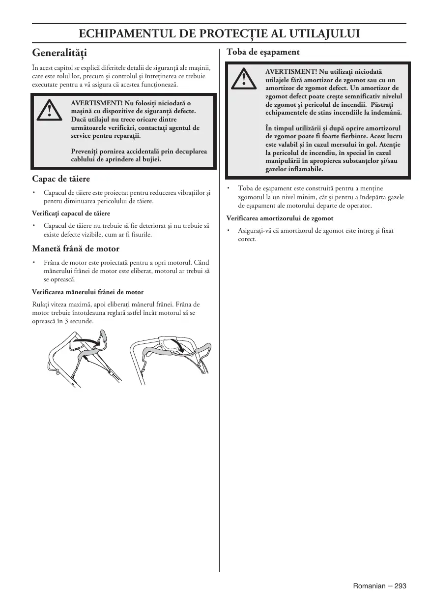 AVERTISMENT! Nu folosiöi niciodatã o maäinã cu dispozitive de siguranöã defecte. Dacã utilajul nu trece oricare dintre urmãtoarele verificãri, contactaöi agentul de service pentru reparaöii. În timpul utilizãrii äi dupã oprire amortizorul de zgomot poate fi foarte fierbinte. Acest lucru este valabil äi în cazul mersului în gol. Atenöie la pericolul de incendiu, în special în cazul manipulãrii în apropierea substanöelor äi/sau gazelor inflamabile. Preveniöi pornirea accidentalã prin decuplarea cablului de aprindere al bujiei. Capac de tãiere