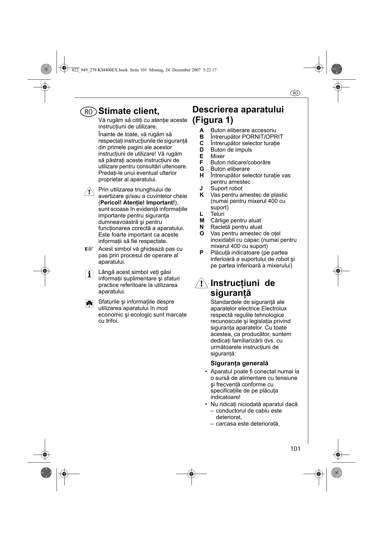 - Reparatiile aparatului pot fi efectuate numai de personal calificat. Ca rezultat al reparatiilor incorcete, se poate produce un pericol considerabil pentru utilizator. Contactati departamentul de service clienti Electrolux sau vanzatorul dvs. in cazul in care sunt necesare reparati.