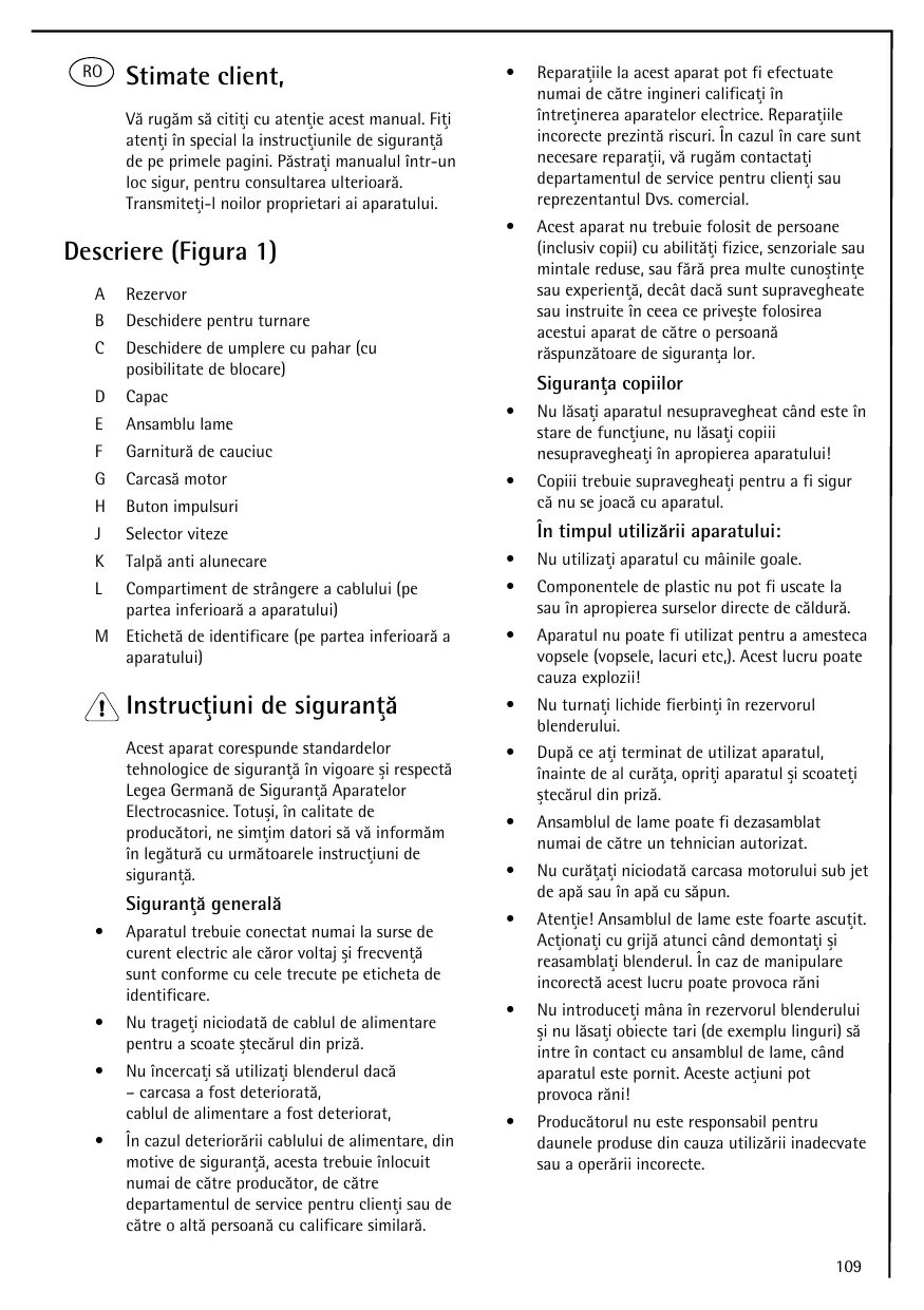 - D ire ctiva EM C 89 /336/EEC cu am e ndam e nte l 9 2/31/EEC şi 9 3/68/EEC Introduce ţi ansam bl ulcu l am ă ţinând e nde rulorie ntat în jos. Rotiţi- lîn se nsul ace l or de ce as pe ntru fixare , fol osind cana de m ăsură (Figura 6). Ate nţie ! A se m ane vra cu grijă! D ate te h nice Vol taj: 230/240 V Pute re : 500 W Exe m pl e de util izare e nde rulpoate fi util izat pe ntru a am e ste ca o gam ă l argă de băuturi, pe ntru a zdrobi gh e aţa, pe ntru a m ărunţi fructe şi l e gum e , pe ntru a bate frişcă e tc. Com partim e nt de strânge re a cabl