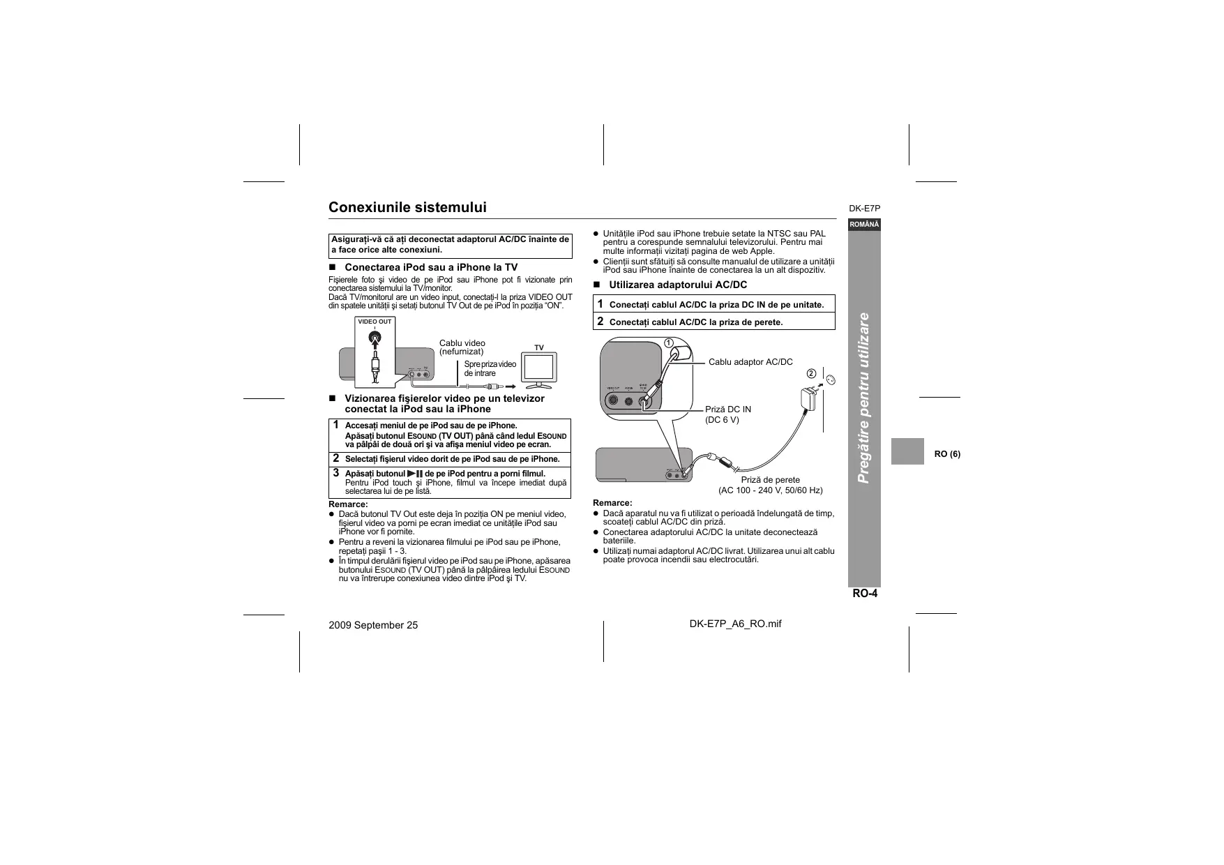 RO-5 Conexiunile sistemului (continuare) M" Utilizarea cu baterii Utizaÿ 4 bateri de märme “AA (UM/SUM= similare) Baterile nu sunt incluse. RG, HP-7 sau T Deschidef capacul baterilor. Impingeti capacul in directia indicatä de sägeatä. Z introducef bateria conform direciel indicate In compart- mentul pentru baterie. 3 inchideficiapa. Remarcä: Durata de via à baterilor poate viara in funcfie de temperaturë, de tip si de condilile de utilizare. Inlocuirea baterillor: În cazul in care nivelu baterilor este scäzut, sunelul poate fi distorsiona, iar unitatea se poate opri in mod automet sau poste opri sunetul utlizat la nivel inalt. Reducefi volumul Suneluiui seu nlocui baterile. Atentie: Nu utlizaÿ bateri, care pot fi reincärcate (baterii cu nichel cadmiu etc.) DK-E7P_A6_RO.mif Precaufi pentru utilizarea bateriei: Plasarea incoreclä a balerilor poate provoca defecfuni. Introducet bateria conform direclei indicate in compartimentul pentru Bateri. Dacä aparaul nu va fiutlizal o perioadä indelungatä de tmp, exiragel balerile, Aceasta va preveni eventualete defectuni, £are pol apârea in uma scurgen balerilor. + in impul funcionäri pe bateri,luminozitatea indicatoarelor va fimairedusà decal in impul utlizaréri adaplorului ACDC. inlocuif toate baterile vechi eu cele noi in acelagi imp. + Nu amestecaf balerile vechi cu cele noi. Baterile (cutia eu bateri sau baterile deja instalate) nu pot fr expuse la cäldura excesivà cum ar filumina soarelu, 10e sau léle asemenea. Schimbarea sursei de energie: Oprif uniatea Inainte de schimbarea sursei de energie. Dacä conectali cablul 6 V DC in timpul functionäri unitäti, aceasta poale intra automat in setarea stand-by. Apäsali din nou butonul ONISTAND-BY pentru a reporni unitaleal 2009 September 25