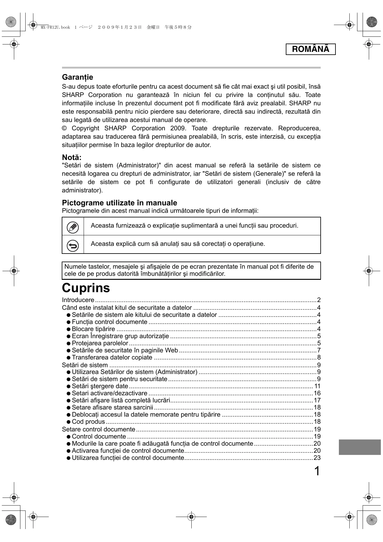 - ROMÂNÃ Garanţie S-au depus toate eforturile pentru ca acest document să fie cât mai exact şi util posibil, însă SHARP Corporation nu garantează în niciun fel cu privire la conţinutul său. Toate informaţiile incluse în prezentul document pot fi modificate fără aviz prealabil. SHARP nu este responsabilă pentru nicio pierdere sau deteriorare, directă sau indirectă, rezultată din sau legată de utilizarea acestui manual de operare. © Copyright SHARP Corporation 2009. Toate drepturile rezervate. Reproducerea, adaptarea sau traducerea fără permisiunea prealabilă, în scris, este interzisă, cu excepţia situaţiilor permise în baza legilor drepturilor de autor. Notă: "Setări de sistem (Administrator)" din acest manual se referă la setările de sistem ce necesită logarea cu drepturi de administrator, iar "Setări de sistem (Generale)" se referă la setările de sistem ce pot fi configurate de utilizatori generali (inclusiv de către administrator). Pictograme utilizate în manuale Pictogramele din acest manual indică următoarele tipuri de informaţii: Aceasta furnizează o explicaţie suplimentară a unei funcţii sau proceduri. Aceasta explică cum să anulaţi sau să corectaţi o operaţiune. Numele tastelor, mesajele şi afişajele de pe ecran prezentate în manual pot fi diferite de cele de pe produs datorită îmbunătăţirilor şi modificărilor. Cuprins Introducere p. 2