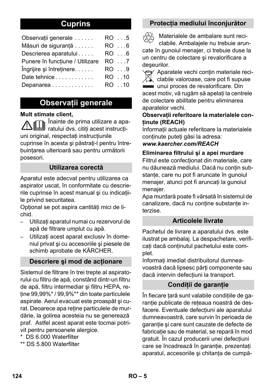 Observaţii generale Mult stimate client, Înainte de prima utilizare a aparatului dvs. citiţi acest instrucţiuni original, respectaţi instrucţiunile cuprinse în acesta şi păstraţi-l pentru întrebuinţarea ulterioară sau pentru următorii posesori. Utilizarea corectă Aparatul este adecvat pentru utilizarea ca aspirator uscat, în conformitate cu descrierile cuprinse în acest manual şi cu indicaţiile privind securitatea. Opţional se pot aspira cantităţi mici de lichid. – Utilizaţi aparatul numai cu rezervorul de apă de filtrare umplut cu apă. – Utilizaţi acest aparat exclusiv în domeniul privat şi cu accesoriile şi piesele de schimb aprobate de KÄRCHER. Descriere şi mod de acţionare Sistemul de filtrare în trei trepte al aspiratorului cu filtru de apă, constând dintr-un filtru de apă, filtru intermediar şi filtru HEPA, reţine 99,99%* / 99,9%** din toate particulele aspirate. Aerul evacuat este proaspăt şi curat. Deoarece apa reţine particulele de murdărie, la golirea acesteia nu se generează praf. Astfel acest aparat este tocmai potrivit pentru persoanele alergice.