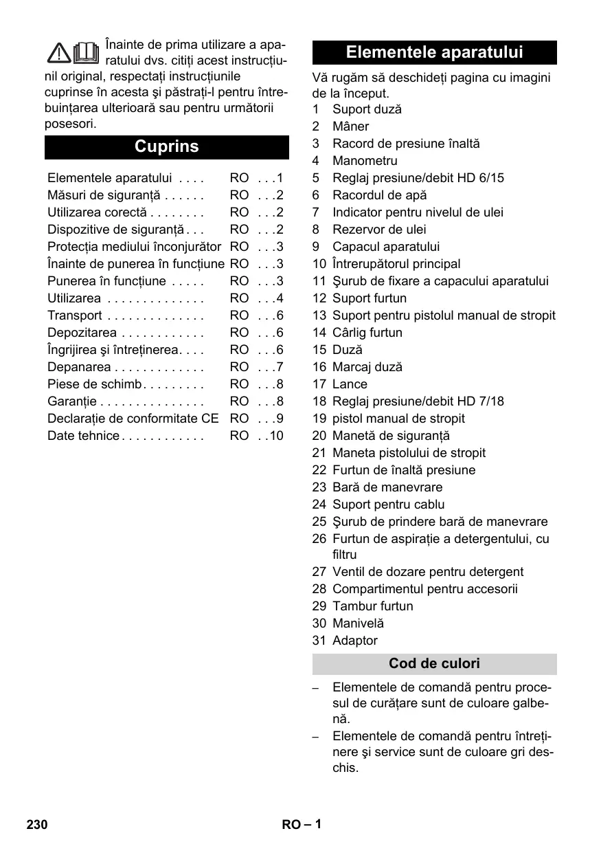 Elementele aparatului Vă rugăm să deschideţi pagina cu imagini de la început. 1 Suport duză 2 Mâner 3 Racord de presiune înaltă 4 Manometru 5 Reglaj presiune/debit HD 6/15 6 Racordul de apă 7 Indicator pentru nivelul de ulei 8 Rezervor de ulei 9 Capacul aparatului 10 Întrerupătorul principal 11 Şurub de fixare a capacului aparatului 12 Suport furtun 13 Suport pentru pistolul manual de stropit 14 Cârlig furtun 15 Duză 16 Marcaj duză 17 Lance 18 Reglaj presiune/debit HD 7/18 19 pistol manual de stropit 20 Manetă de siguranţă 21 Maneta pistolului de stropit 22 Furtun de înaltă presiune 23 Bară de manevrare 24 Suport pentru cablu 25 Şurub de prindere bară de manevrare 26 Furtun de aspiraţie a detergentului, cu filtru 27 Ventil de dozare pentru detergent 28 Compartimentul pentru accesorii 29 Tambur furtun 30 Manivelă 31 Adaptor Cod de culori