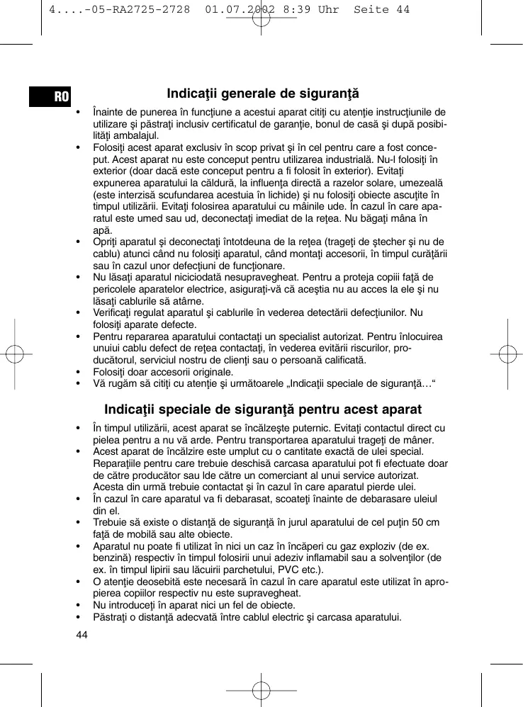 Înainte de punerea în funcfliune a acestui aparat citifli cu atenflie instrucfliunile de utilizare øi pæstrafli inclusiv certificatul de garanflie, bonul de casæ øi dupæ posibilitæfli ambalajul. Folosifli acest aparat exclusiv în scop privat øi în cel pentru care a fost conceput. Acest aparat nu este conceput pentru utilizarea industrialæ. Nu-l folosifli în exterior (doar dacæ este conceput pentru a fi folosit în exterior). Evitafli expunerea aparatului la cælduræ, la influenfla directæ a razelor solare, umezealæ (este interzisæ scufundarea acestuia în lichide) øi nu folosifli obiecte ascuflite în timpul utilizærii. Evitafli folosirea aparatului cu mâinile ude. În cazul în care aparatul este umed sau ud, deconectafli imediat de la reflea. Nu bægafli mâna în apæ. Oprifli aparatul øi deconectafli întotdeuna de la reflea (tragefli de øtecher øi nu de cablu) atunci când nu folosifli aparatul, când montafli accesorii, în timpul curæflærii sau în cazul unor defecfliuni de funcflionare. Nu læsafli aparatul niciciodatæ nesupravegheat. Pentru a proteja copiii faflæ de pericolele aparatelor electrice, asigurafli-væ cæ aceøtia nu au acces la ele øi nu læsafli cablurile sæ atârne. Verificafli regulat aparatul øi cablurile în vederea detectærii defecfliunilor. Nu folosifli aparate defecte. Pentru repararea aparatului contactafli un specialist autorizat. Pentru înlocuirea unuiui cablu defect de reflea contactafli, în vederea evitærii riscurilor, producætorul, serviciul nostru de clienfli sau o persoanæ calificatæ. Folosifli doar accesorii originale. Væ rugæm sæ citifli cu atenflie øi urmætoarele „Indicaflii speciale de siguranflæ…“