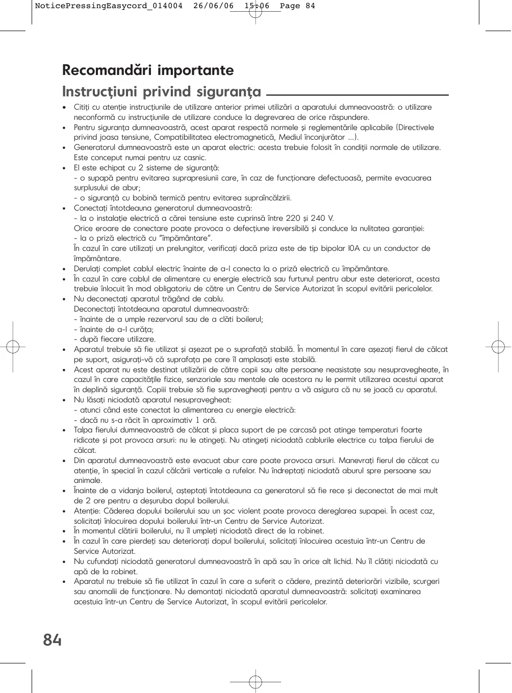 Recomandäri importante Instructiuni p nd siguranta Cititi cu atentie instructiunile de utilizare anterior primei utilizäri a aparatului dumneavoasträ: o utilizare neconformä cu instructiunile de utilizare conduce la degrevarea de orice räspundere. Pentru siguranta dumneavoasträ, acest aparat respectä normele si reglementèrile aplicabile (Directivele privind joasa tensiune, Compatibilitatea electromagneticä, Mediul inconjurätor ….]. Generatorul dumneavoastrà este un aparat electric: acesta trebuie folosit în conditii normale de utilzare. Este conceput numaï pentru uz casnic. El este echipat cu 2 sisteme de sigurantär - o supapà pentru evitarea suprapresiunii care, in caz de functionare defectuoasä, permite evacuarea surplusului de abur; - o siguranfä cu bobinä termicä pentru evitarea suproïncälzirii Conectati itotdeauna generatorul dumneavoastré - la o instalatie electric a cärei tensiune este cuprinsä între 220 si 240 V. Orice eroare de conectare poate provoca o defectiune ireversibilà si conduce la nulitatea garantiei. - la o prizä electric cu “impämäntare" În cazul in care utiizati un prelungitor, verificati dacä priza este de tip bipolar I0A eu un conductor de impämäntare Derulati complet cablul electric înainte de a-l conecta la o prizä electric cu impämäntare. În cazul in care cablul de alimentare cu energie electricä sau furtunul pentru abur este deteriorat, acesta trebuie inlocuit in mod obligatoriu de cätre un Centru de Service Autorizat in scopul evitäri pericolelor. Nu deconectati aparatul trägänd de cablu. Deconectati intotdeauna aparatul dumneavoastré: - nainte de a umple rezervorul sau de a cläti boilerul; - nainte de a-l curëta; - dupä fiecare utilzare. Aparatul trebuie sà fie utilzat si asezat pe o suprafatä stabilà. în momentul in care asezati fierul de cälcat pe suport, asigurati-và cà suprafata pe care îl amplasati este stabilë. Acest aparat nu este destinat utilizärit de cätre copii sau alte persoane neasistate sau nesupravegheate, în cazul in care capacitätil fizice, senzoriale sau mentale ale acestora nu le permit utlizarea acestui aparat fn deplinä sigurantä. Copiii trebuie sà fie supravegheati pentru a và asigura cä nu se joacä cu aparatul Nu lësati niciodatä aparatul nesupravegheat: - atunci când este conectat la alimentarea cu energie electricä: - dacä nu s-a räcit in aproximativ 1 orà. Talpa fierului dumneavoasträ de cälcat si placa suport de pe carcasä pot atinge temperaturi foarte ridicate si pot provoca arsuri: nu le atingeti. Nu atingeti niciodatä cablurile electrice cu talpa fierului de cälcat Din aparatul dumneavoasträ este evacuat abur care poate provoca arsuri. Manevrafi fierul de cälcat cu atentie, in special in cazul cälcärii verticale a rufelor. Nu indreptati niciodatä aburul spre persoane sau animale nainte de a vidanja boilerul, asteptati intotdeauna ca generatorul sà fie rece si deconectat de mai mult de 2 ore pentru a desuruba dopul boilerului Atentie: Cäderea dopului boilerului sau un soc violent poate provoca dereglarea supapei. în acest caz, solicitati inlocuirea dopului boilerului intr-un Centru de Service Autorizat. În momentul clätiit boilerului, nu il umpleti niciodatä direct de la robinet. În cazul in care pierdeti sau deteriorati dopul boilerului, solicitati Mlocuirea acestuia intr-un Centru de Service Autorizat. Nu cufundati niciodatä generatorul dumneavoasträ in apä sau in orice ait lichid. Nu il clätiti niciodatä cu apä de la robinet. Aparatul nu trebuie sà fie utiizat in cazul in care a suferit o cädere, prezintä deteriorëri vizibile, scurgeri sau anomali de functionare. Nu demontati niciodatä aparatul dumneavoasträ: solicitati examinarea acestuia intr-un Centru de Service Autorizat, in scopul evitärii pericolelor. —à&—