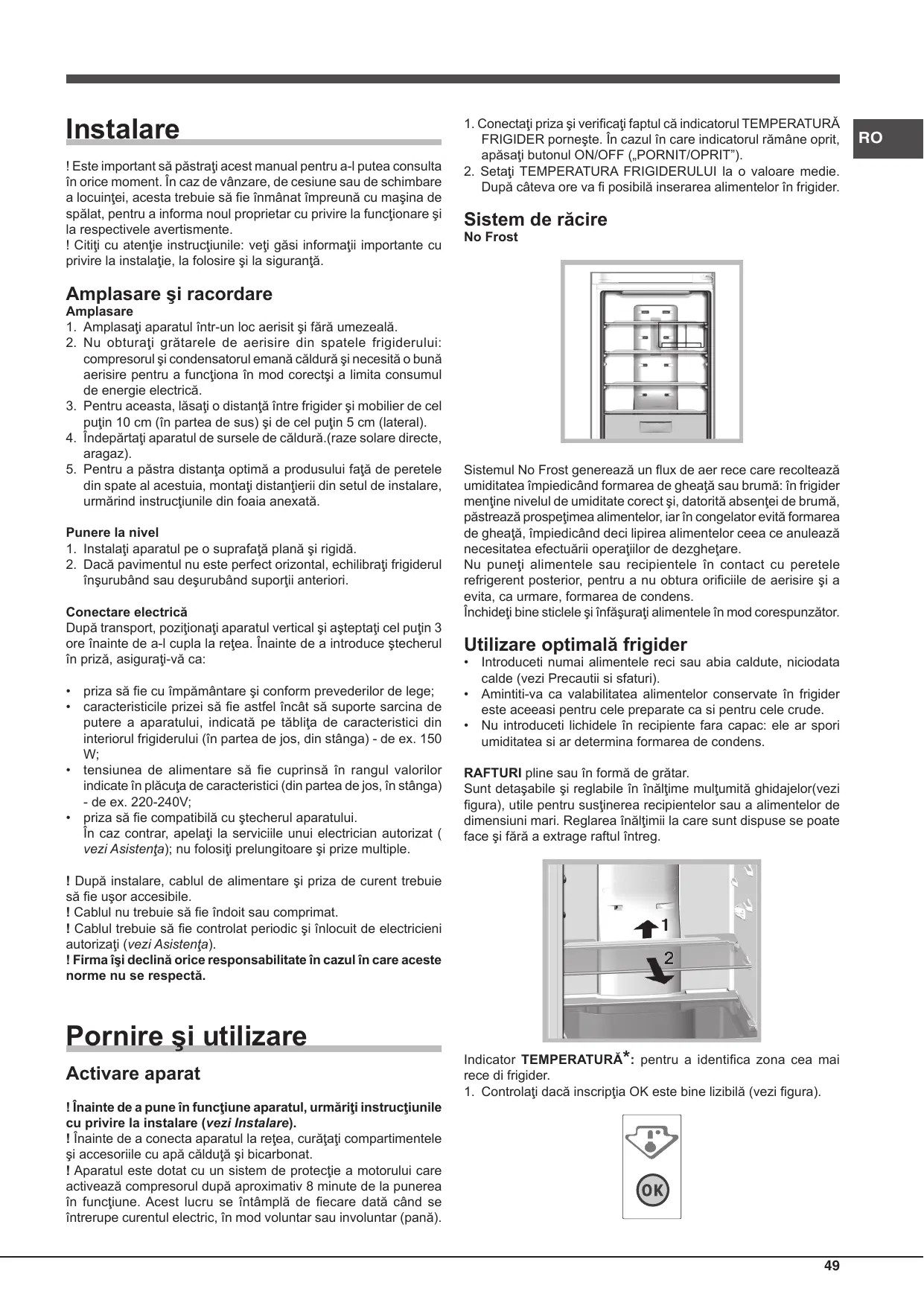 - Nu introduceti lichidele în recipiente fara capac: ele ar spori umiditatea si ar determina formarea de condens. RAFTURI pline sau în formă de grătar. Sunt detaşabile şi reglabile în înălţime mulţumită ghidajelor(vezi figura), utile pentru susţinerea recipientelor sau a alimentelor de dimensiuni mari. Reglarea înălţimii la care sunt dispuse se poate face şi fără a extrage raftul întreg. ! După instalare, cablul de alimentare şi priza de curent trebuie să fie uşor accesibile. ! Cablul nu trebuie să fie îndoit sau comprimat. ! Cablul trebuie să fie controlat periodic şi înlocuit de electricieni autorizaţi (vezi Asistenţa). ! Firma îşi declină orice responsabilitate în cazul în care aceste norme nu se respectă. Pornire şi utilizare Activare aparat ! Înainte de a pune în funcţiune aparatul, urmăriţi instrucţiunile cu privire la instalare (vezi Instalare). ! Înainte de a conecta aparatul la reţea, curăţaţi compartimentele şi accesoriile cu apă călduţă şi bicarbonat. ! Aparatul este dotat cu un sistem de protecţie a motorului care activează compresorul după aproximativ 8 minute de la punerea în funcţiune. Acest lucru se întâmplă de fiecare dată când se întrerupe curentul electric, în mod voluntar sau involuntar (pană). Indicator TEMPERATURĂ*: pentru a identifica zona cea mai rece di frigider.