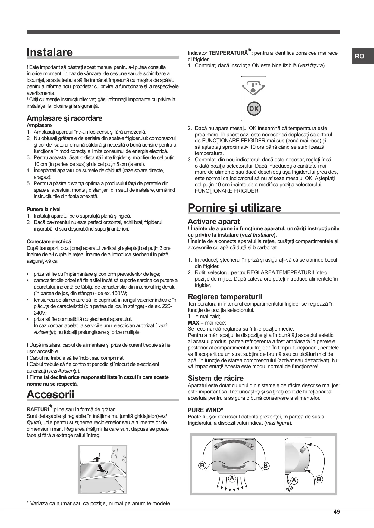 RO RO Wind Pure optimizează circulaţia aerului ameliorând eficienţa evaporatorului şi contribuind astfel la crearea temperaturii ideale în frigider, în cel mai scurt timp, după fiecare deschidere a uşii. Aerul suflat (A) se răceşte când intră în contact cu pereţii reci, iar aerul mai cald (B) este aspirat (vezi figura). Produsele Wind Pure Plus sunt dotate şi cu un filtru, care permite – mulţumită compoziţiei speciale cu ioni de argint – reducerea bacteriilor până la 70% precum şi neutralizarea mirosurilor urâte din frigider, garantând o mai bună păstrare a alimentelor. Dacă reglaţi selectorul pentru REGLAREA TEMPERATURII la valori mari, cu frigiderul plin şi cu o temperatură exterioară ridicată, se poate ca şi aparatul să funcţioneze continuu, favorizând astfel formarea excesivă de brumă (cu consum mare de energie). Evitaţi acest lucru, reglând selectorul în dreptul unor valori mai mici (frigiderul va elimina bruma în mod automat). Static Modelele fără Aircooler au instalaţia de răcire situată în peretele posterior al compartimentelor; ca urmare, acesta va fi tot timpul acoperit de brumă sau de picături de apă, în funcţie de compresor (activat sau în pauză). Oricare din aceste două situaţii este normală. Dacă reglaţi selectorul pentru REGLAREA TEMPERATURII la valori mari, cu frigiderul plin şi cu o temperatură exterioară ridicată, se poate ca şi aparatul să funcţioneze continuu, favorizând astfel formarea excesivă de brumă (cu consum mare de energie). Evitaţi acest lucru, reglând selectorul în dreptul unor valori mai mici (frigiderul va elimina bruma în mod automat). : aerul mai rece coboară deoarece este mai greu. Iată cum puteţi aşeza alimentele: Alimente Carne şi peşte curăţat