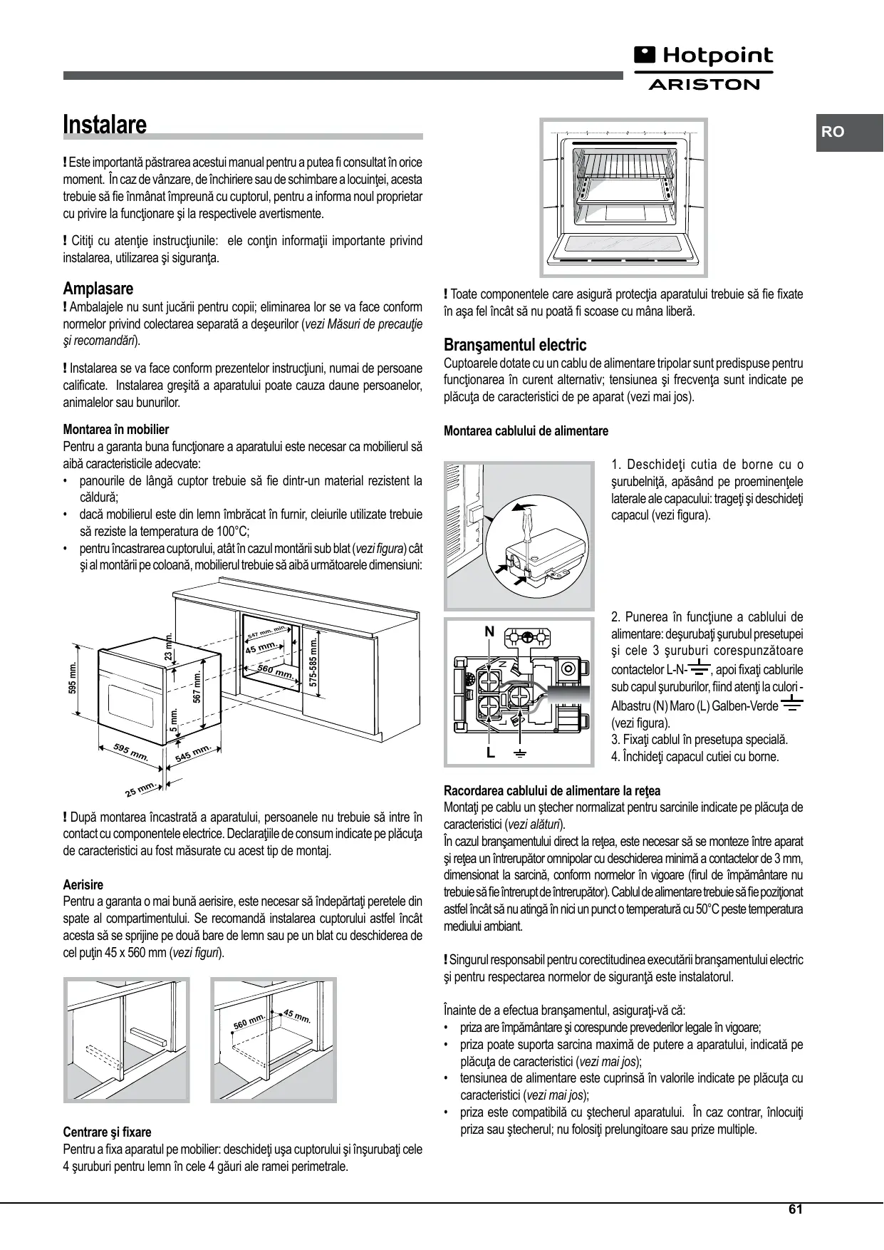! Este importantă păstrarea acestui manual pentru a putea fi consultat în orice moment. În caz de vânzare, de închiriere sau de schimbare a locuinţei, acesta trebuie să fie înmânat împreună cu cuptorul, pentru a informa noul proprietar cu privire la funcţionare şi la respectivele avertismente. ! Citiţi cu atenţie instrucţiunile: ele conţin informaţii importante privind instalarea, utilizarea şi siguranţa. Amplasare ! Ambalajele nu sunt jucării pentru copii; eliminarea lor se va face conform normelor privind colectarea separată a deşeurilor (vezi Măsuri de precauţie şi recomandări). ! Toate componentele care asigură protecţia aparatului trebuie să fie fixate în aşa fel încât să nu poată fi scoase cu mâna liberă. Branşamentul electric ! Instalarea se va face conform prezentelor instrucţiuni, numai de persoane calificate. Instalarea greşită a aparatului poate cauza daune persoanelor, animalelor sau bunurilor. Cuptoarele dotate cu un cablu de alimentare tripolar sunt predispuse pentru funcţionarea în curent alternativ; tensiunea şi frecvenţa sunt indicate pe plăcuţa de caracteristici de pe aparat (vezi mai jos). Montarea în mobilier Pentru a garanta buna funcţionare a aparatului este necesar ca mobilierul să aibă caracteristicile adecvate: