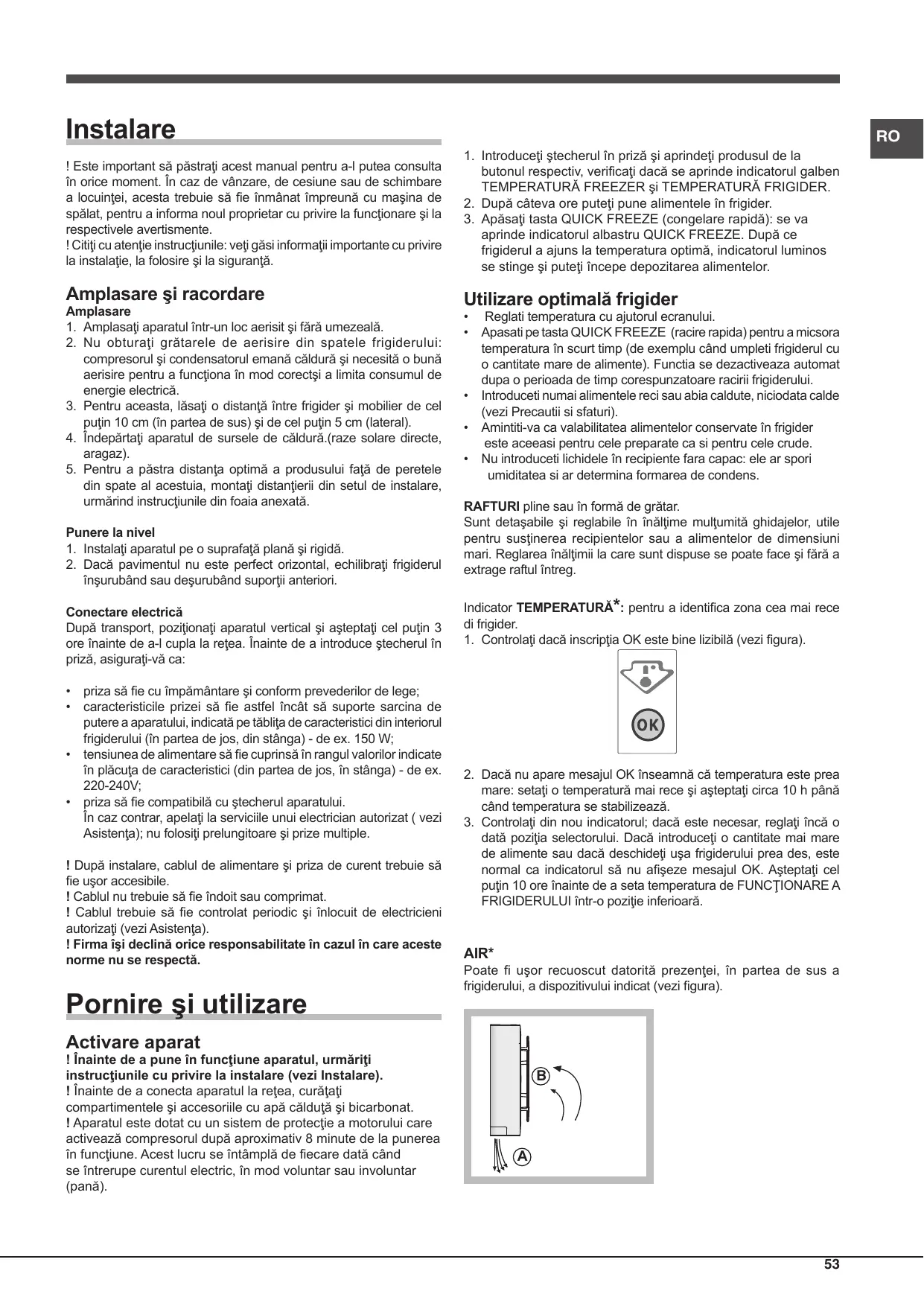 • Reglati temperatura cu ajutorul ecranului. • Apasati pe tasta QUICK FREEZE (racire rapida) pentru a micsora temperatura în scurt timp (de exemplu când umpleti frigiderul cu o cantitate mare de alimente). Functia se dezactiveaza automat dupa o perioada de timp corespunzatoare racirii frigiderului. • Introduceti numai alimentele reci sau abia caldute, niciodata calde (vezi Precautii si sfaturi). • Amintiti-va ca valabilitatea alimentelor conservate în frigider este aceeasi pentru cele preparate ca si pentru cele crude. • Nu introduceti lichidele în recipiente fara capac: ele ar spori umiditatea si ar determina formarea de condens. RAFTURI pline sau în formă de grătar. Sunt detaşabile şi reglabile în înălţime mulţumită ghidajelor, utile pentru susţinerea recipientelor sau a alimentelor de dimensiuni mari. Reglarea înălţimii la care sunt dispuse se poate face şi fără a extrage raftul întreg. Indicator TEMPERATURĂ*: pentru a identifica zona cea mai rece di frigider. 1. Controlaţi dacă inscripţia OK este bine lizibilă (vezi figura).