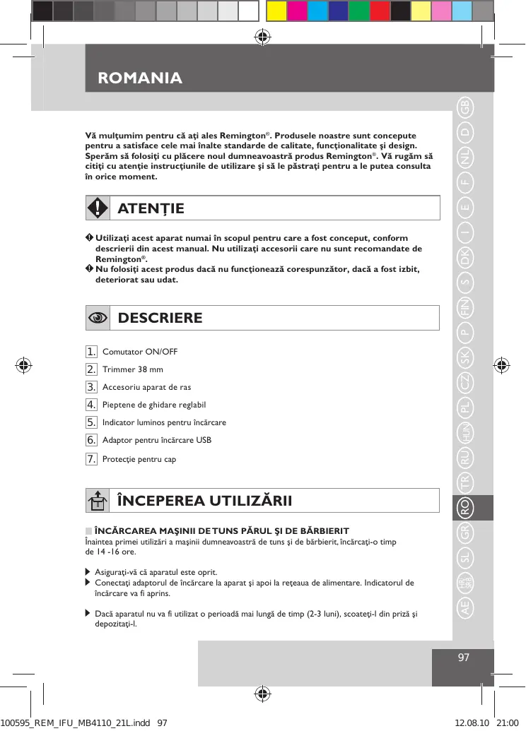 DK I ATENŢIE E Vă mulţumim pentru că aţi ales Remington®. Produsele noastre sunt concepute pentru a satisface cele mai înalte standarde de calitate, funcţionalitate şi design. Sperăm să folosiţi cu plăcere noul dumneavoastră produs Remington®. Vă rugăm să citiţi cu atenţie instrucţiunile de utilizare şi să le păstraţi pentru a le putea consulta în orice moment.