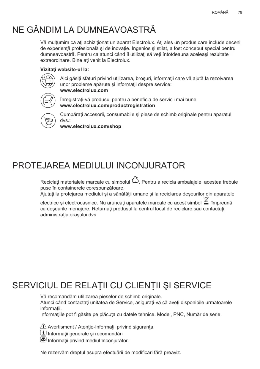 Vă mulţumim că aţi achiziţionat un aparat Electrolux. Aţi ales un produs care include decenii de experienţă profesională şi de inovaţie. Ingenios şi stilat, a fost conceput special pentru dumneavoastră. Pentru ca atunci când îl utilizaţi să veţi întotdeauna aceleaşi rezultate extraordinare. Bine aţi venit la Electrolux. Vizitaţi website-ul la: Aici găsiţi sfaturi privind utilizarea, broşuri, informaţii care vă ajută la rezolvarea unor probleme apărute şi informaţii despre service: www.electrolux.com Înregistraţi-vă produsul pentru a beneficia de servicii mai bune: www.electrolux.com/productregistration Cumpăraţi accesorii, consumabile şi piese de schimb originale pentru aparatul dvs.: www.electrolux.com/shop